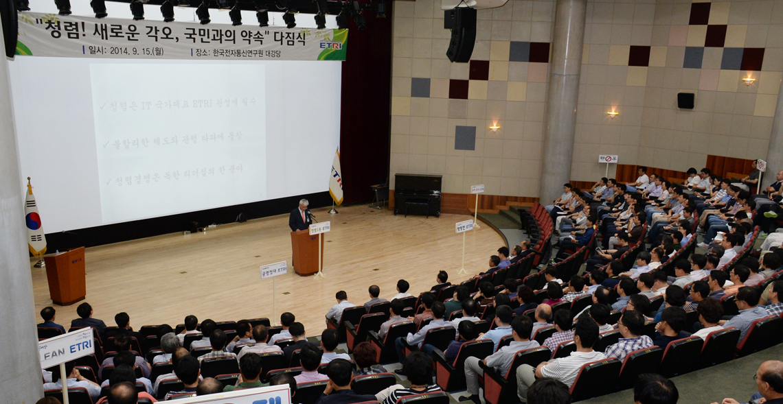 2014년 9월 15일에 개최된 ‘청렴다짐식’. ETRI는 e-감사시스템, 부패행위자 처벌 강화, 청렴다짐식 등 윤리 문화 내재화를 위해 노력했다.