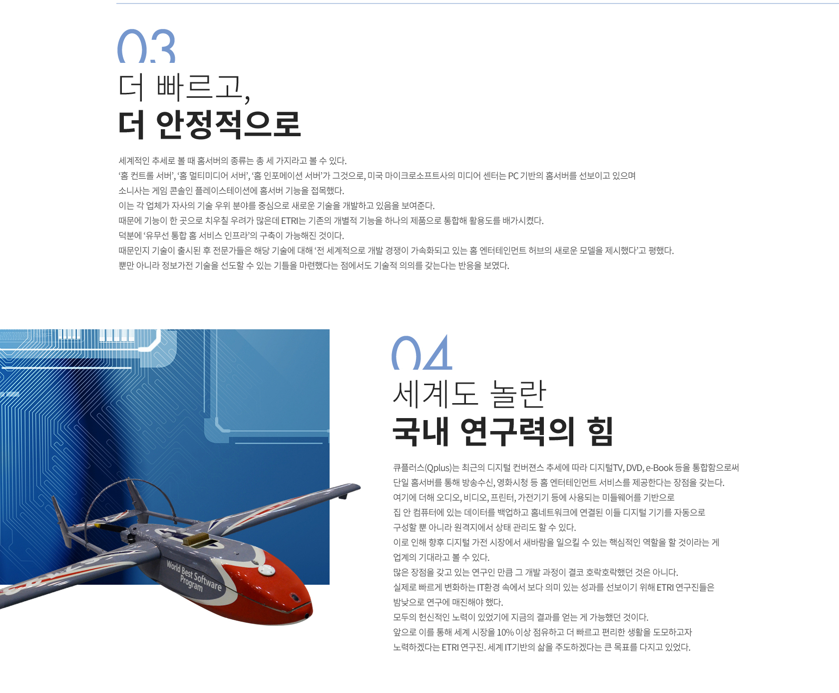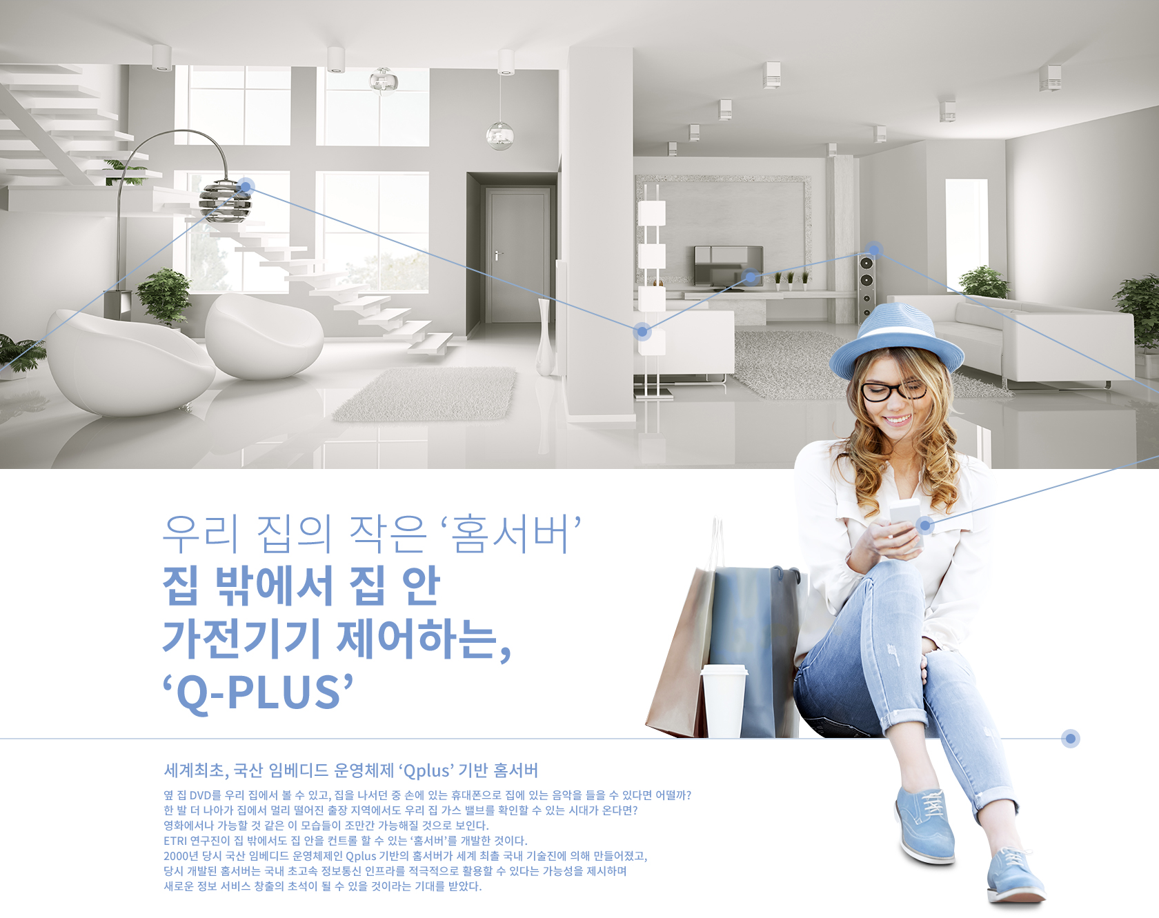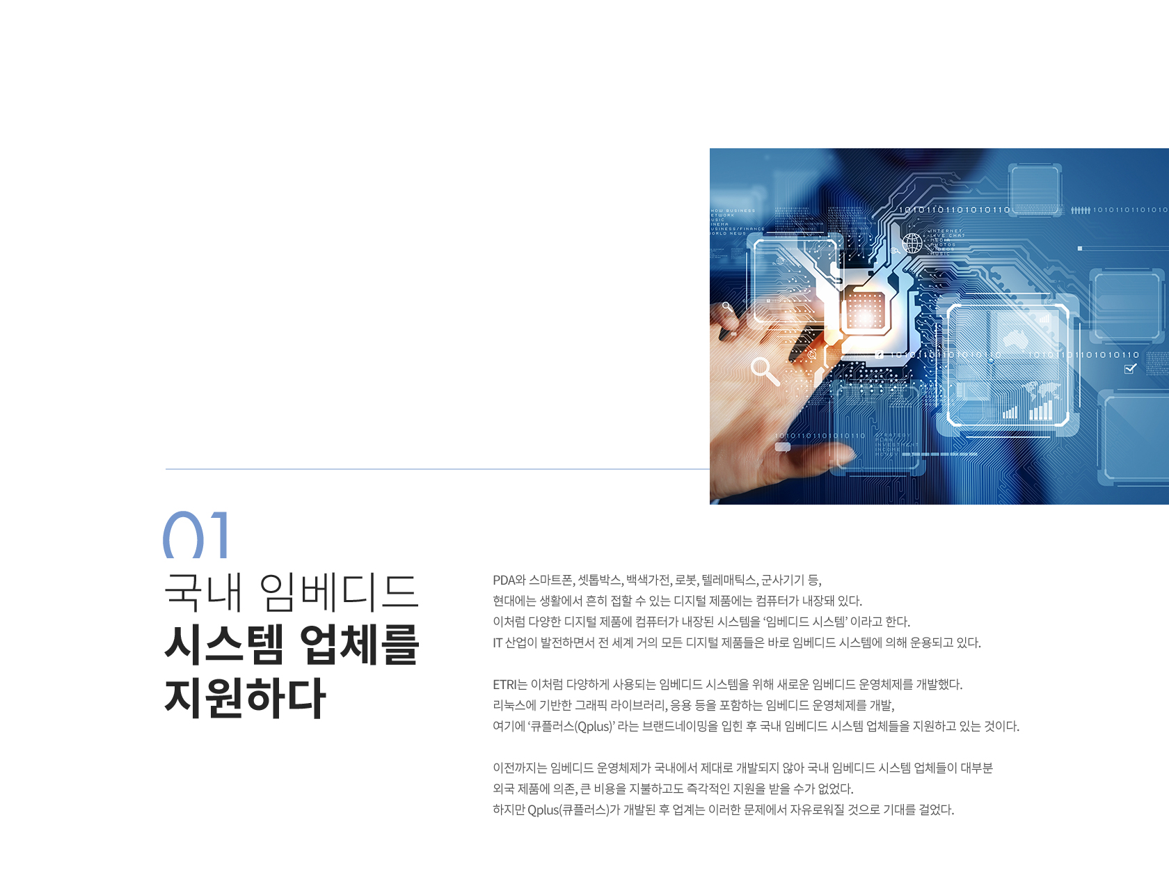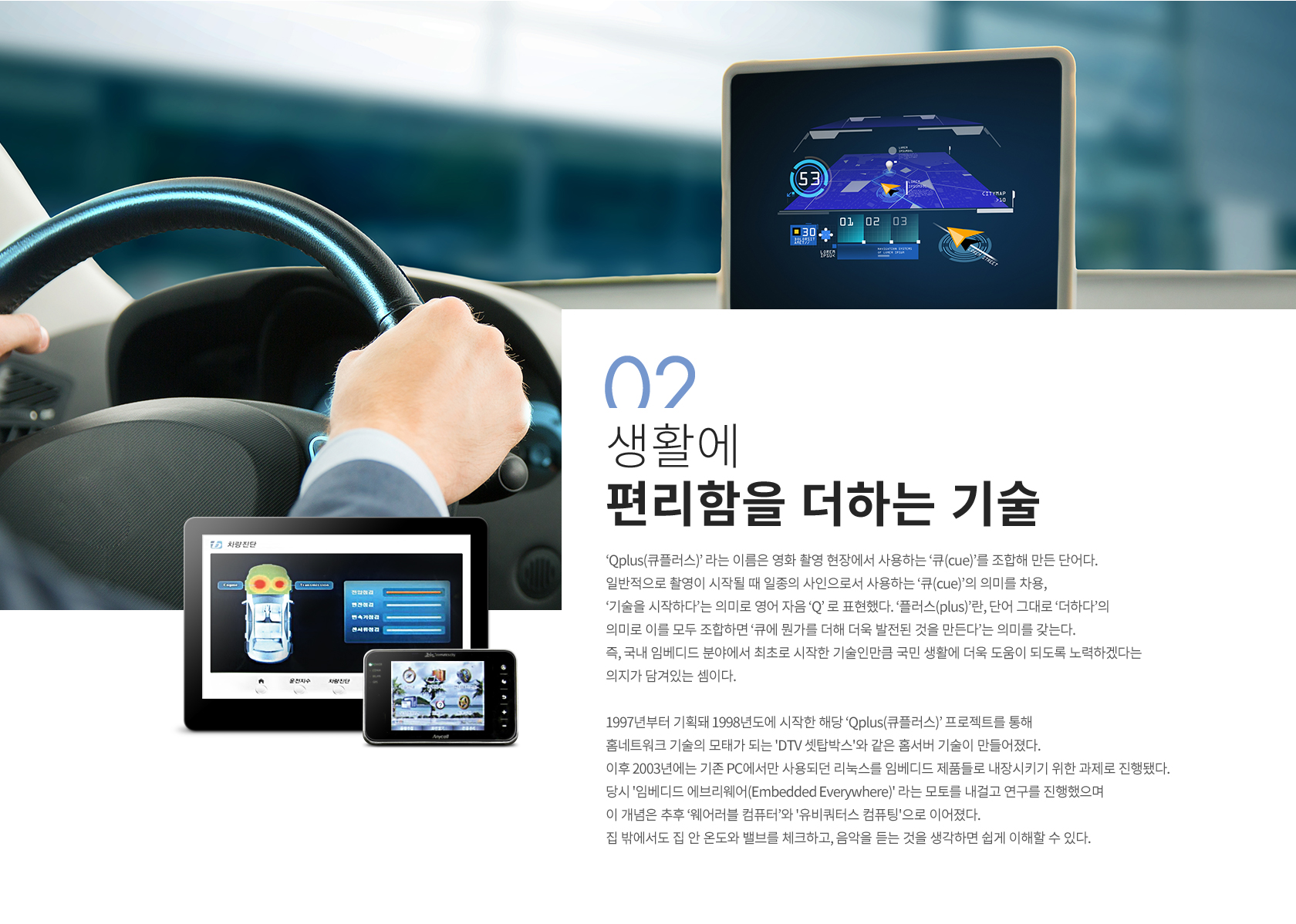 1997년부터 기획돼 1998년도에 시작한 해당 ‘Qplus(큐플러스)’ 프로젝트를 통해 홈네트워크 기술의 모태가 되는 'DTV 셋탑박스'와 같은 홈서버 기술이 만들어졌다. 이후 2003년에는 기존 PC에서만 사용되던 리눅스를 임베디드 제품들로 내장시키기 위한 과제로 진행됐다. 당시 '임베디드 에브리웨어(Embedded Everywhere)' 라는 모토를 내걸고 연구를 진행했으며 이 개념은 추후 ‘웨어러블 컴퓨터’와 '유비쿼터스 컴퓨팅'으로 이어졌다.
