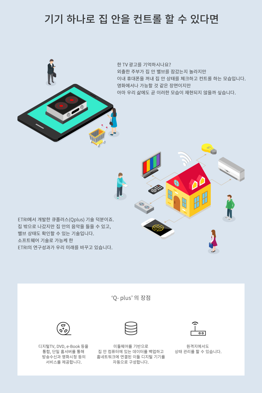 큐플러스(Qplus)는 최근의 디지털 컨버젼스 추세에 따라 디지털TV, DVD, e-Book 등을 통합함으로써 단일 홈서버를 통해 방송수신, 영화시청 등 홈 엔터테인먼트 서비스를 제공한다는 장점을 갖는다. 여기에 더해 오디오, 비디오, 프린터, 가전기기 등에 사용되는 미들웨어를 기반으로 집 안 컴퓨터에 있는 데이터를 백업하고 홈네트워크에 연결된 이들 디지털 기기를 자동으로 구성할 뿐 아니라 원격지에서 상태 관리도 할 수 있다.