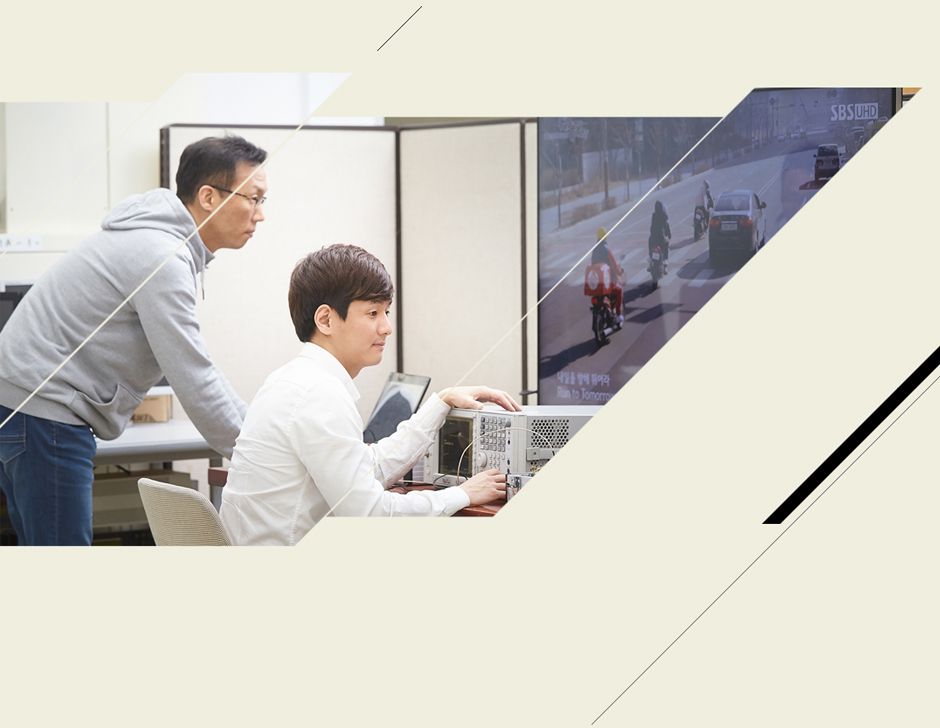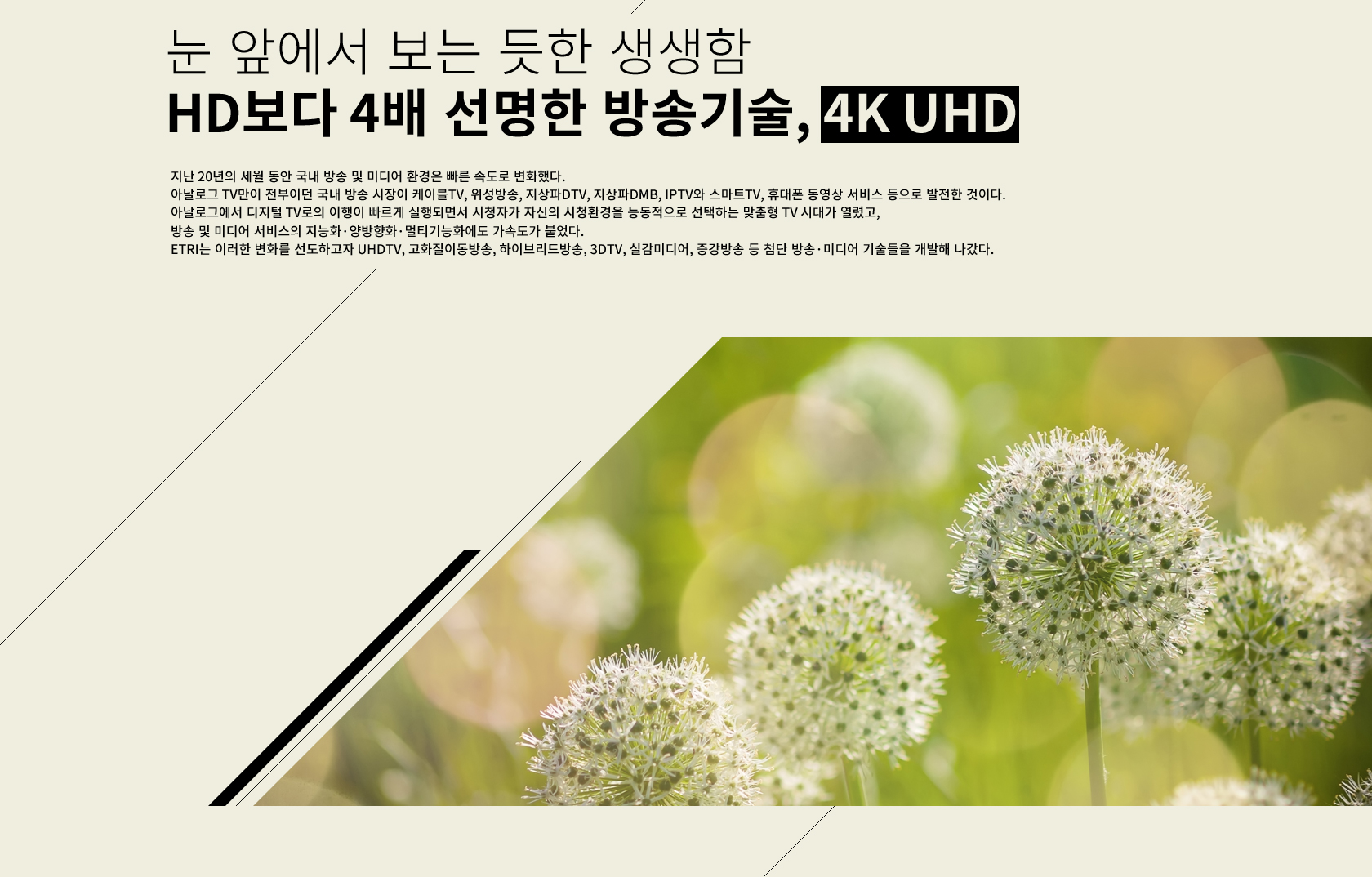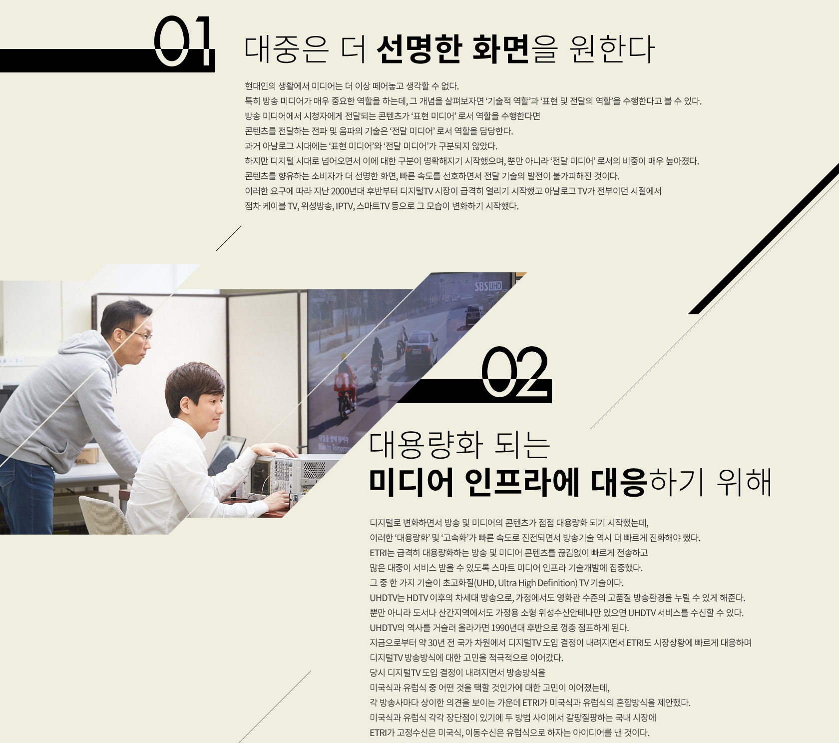 그 중 한 가지 기술이 초고화질(UHD, Ultra High Definition) TV 기술이다. UHDTV는 HDTV 이후의 차세대 방송으로, 가정에서도 영화관 수준의 고품질 방송환경을 누릴 수 있게 해준다. 뿐만 아니라 도서나 산간지역에서도 가정용 소형 위성수신안테나만 있으면 UHDTV 서비스를 수신할 수 있다. UHDTV의 역사를 거슬러 올라가면 1990년대 후반으로 껑충 점프하게 된다. 지금으로부터 약 30년 전 국가 차원에서 디지털TV 도입 결정이 내려지면서 ETRI도 시장상황에 빠르게 대응하며 디지털TV 방송방식에 대한 고민을 적극적으로 이어갔다. 당시 디지털TV 도입 결정이 내려지면서 방송방식을 미국식과 유럽식 중 어떤 것을 택할 것인가에 대한 고민이 이어졌는데, 각 방송사마다 상이한 의견을 보이는 가운데 ETRI가 미국식과 유럽식의 혼합방식을 제안했다. 미국식과 유럽식 각각 장단점이 있기에 두 방법 사이에서 갈팡질팡하는 국내 시장에 ETRI가 고정수신은 미국식, 이동수신은 유럽식으로 하자는 아이디어를 낸 것이다.
