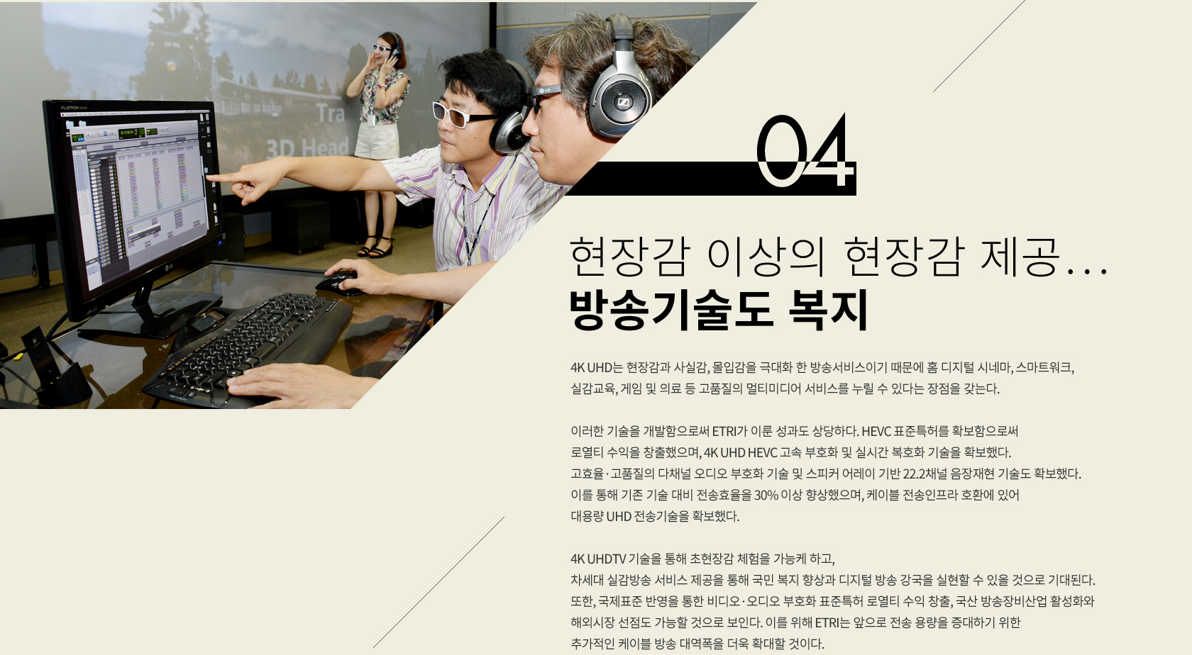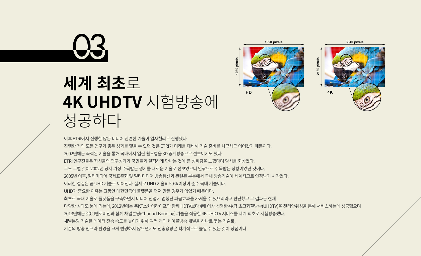 이후 ETRI에서 진행한 많은 미디어 관련한 기술이 일사천리로 진행됐다. 진행한 거의 모든 연구가 좋은 성과를 맺을 수 있던 것은 ETRI가 미래를 대비해 기술 준비를 차근차근 이어왔기 때문이다. 2002년에는 축적된 기술을 통해 국내에서 열린 월드컵을 3D 중계방송으로 선보이기도 했다. ETRI 연구진들은 자신들의 연구성과가 국민들과 밀접하게 만나는 것에 큰 성취감을 느꼈다며 당시를 회상했다. 그도 그럴 것이 2002년 당시 가장 주목받는 경기를 새로운 기술로 선보였으니 안팎으로 주목받는 상황이었던 것이다. 2005년 이후, 멀티미디어 국제표준화 및 멀티미디어 방송통신과 관련된 부분에서 국내 방송기술이 세계최고로 인정받기 시작했다. 이러한 결실은 곧 UHD 기술로 이어진다. 실제로 UHD 기술의 50% 이상이 순수 국내 기술이다. UHD가 중요한 이유는 그동안 대한민국이 플랫폼을 먼저 만든 경우가 없었기 때문이다. 최초로 국내 기술로 플랫폼을 구축하면서 미디어 산업에 엄청난 파급효과를 가져올 수 있으리라고 판단했고 그 결과는 현재 다양한 성과도 눈에 띄는데, 2012년에는 ㈜KT스카이라이프와 함께 HDTV보다 4배 이상 선명한 4K급 초고화질방송(UHDTV)을 천리안위성을 통해 서비스하는데 성공했으며 2013년에는 ㈜CJ헬로비전과 함께 채널본딩(Channel Bonding) 기술을 적용한 4K UHDTV 서비스를 세계 최초로 시험방송했다. 채널본딩 기술은 데이터 전송 속도를 높이기 위해 여러 개의 케이블방송 채널을 하나로 묶는 기술로, 기존의 방송 인프라 환경을 크게 변경하지 않으면서도 전송용량은 획기적으로 높일 수 있는 것이 장점이다.