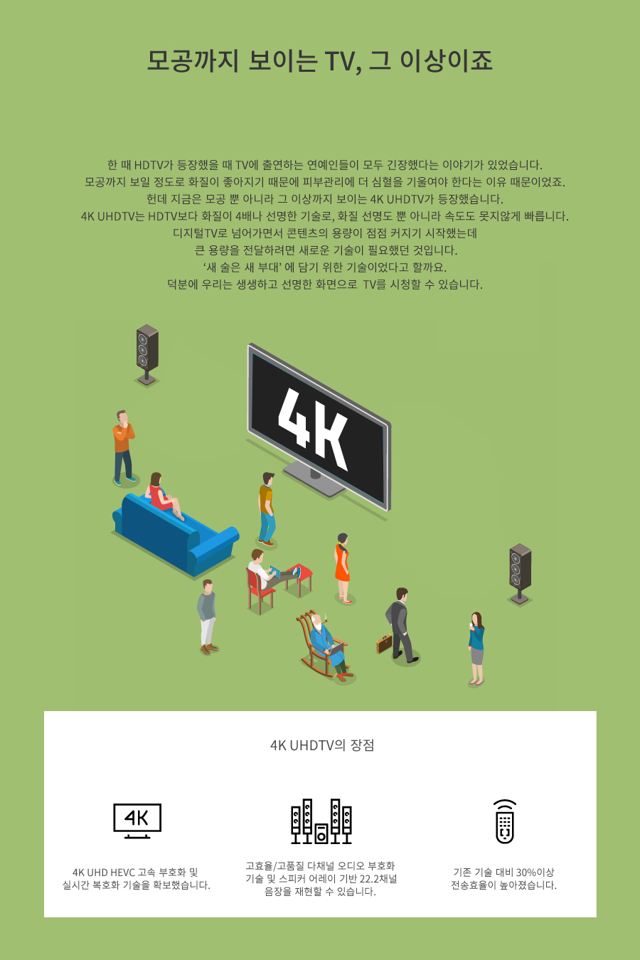 4K UHD는 현장감과 사실감, 몰입감을 극대화 한 방송서비스이기 때문에 홈 디지털 시네마, 스마트워크, 실감교육, 게임 및 의료 등 고품질의 멀티미디어 서비스를 누릴 수 있다는 장점을 갖는다.