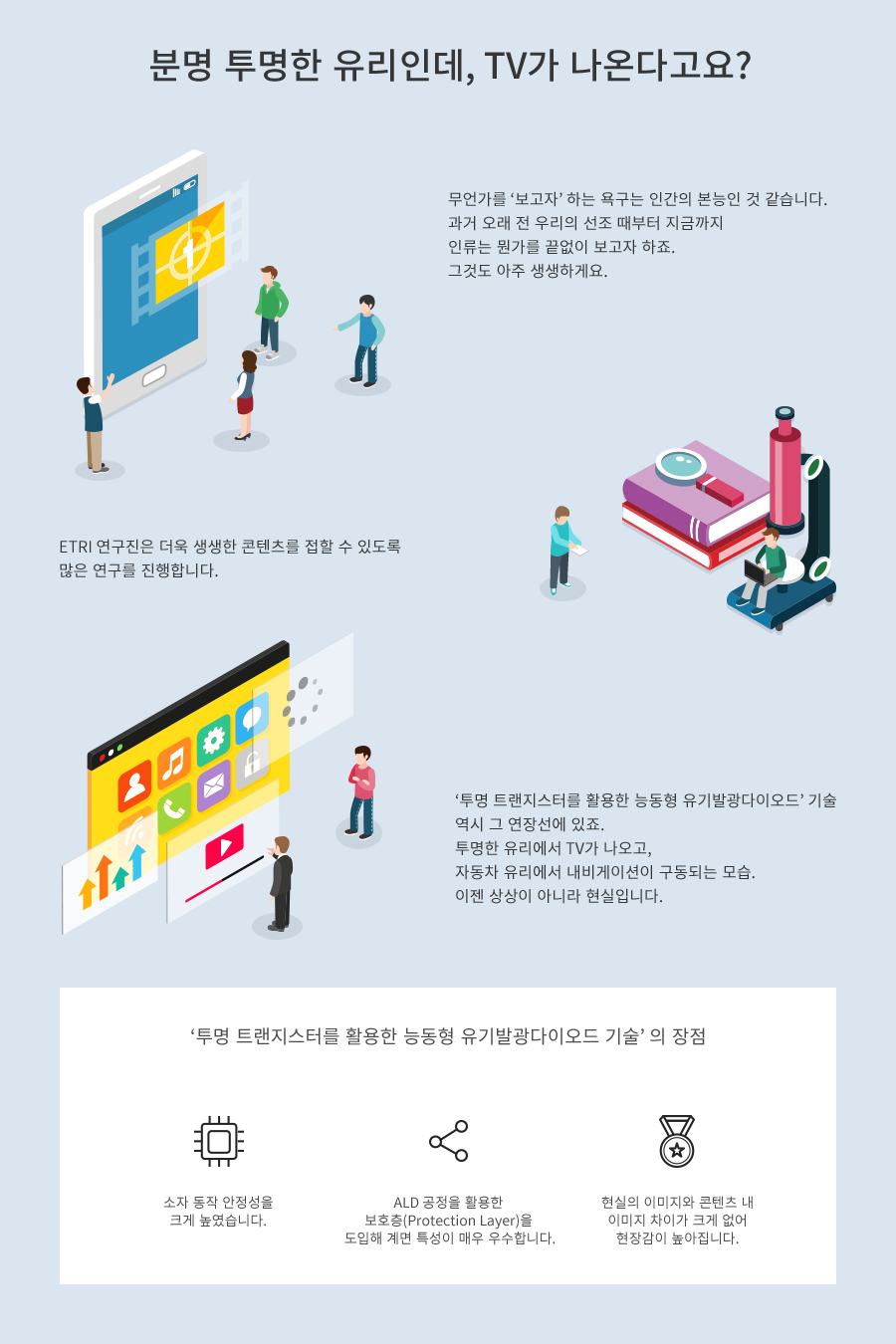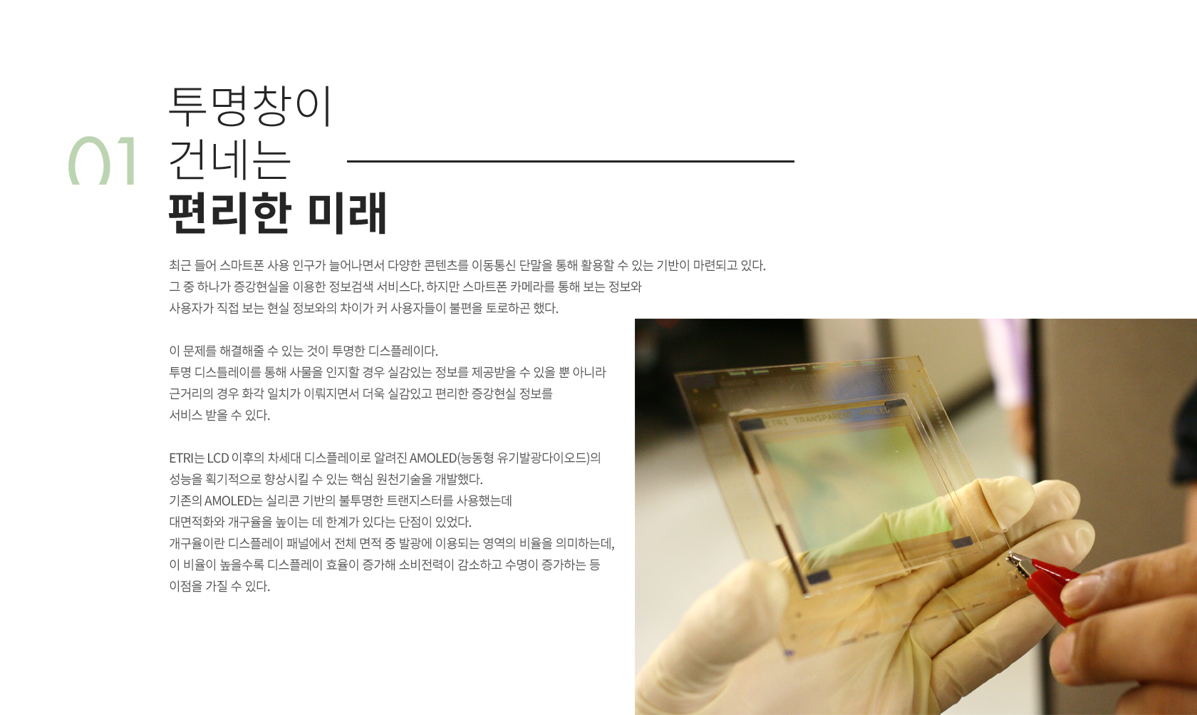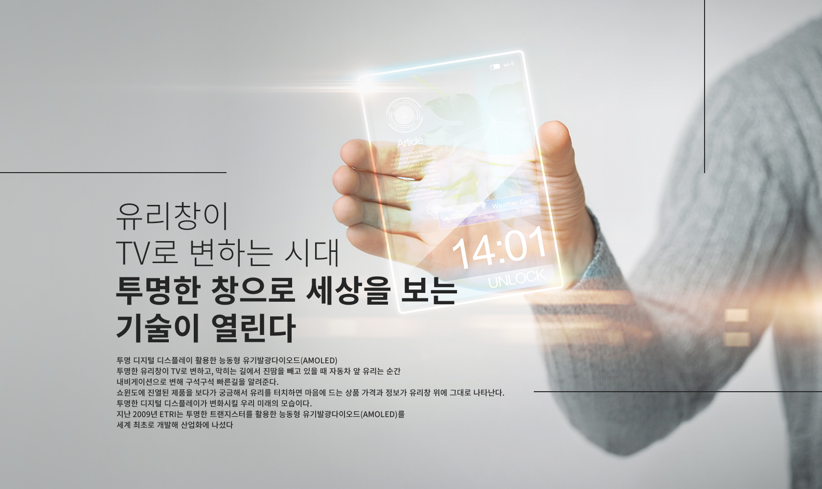 투명한 유리창이 TV로 변하고, 막히는 길에서 진땀을 빼고 있을 때 자동차 앞 유리는 순간 내비게이션으로 변해 구석구석 빠른길을 알려준다. 쇼윈도에 진열된 제품을 보다가 궁금해서 유리를 터치하면 마음에 드는 상품 가격과 정보가 유리창 위에 그대로 나타난다. 투명한 디지털 디스플레이가 변화시킬 우리 미래의 모습이다. 지난 2009년 ETRI는 투명한 트랜지스터를 활용한 능동형 유기발광다이오드 (AMOLED)를 세계 최초로 개발해 산업화에 나섰다.