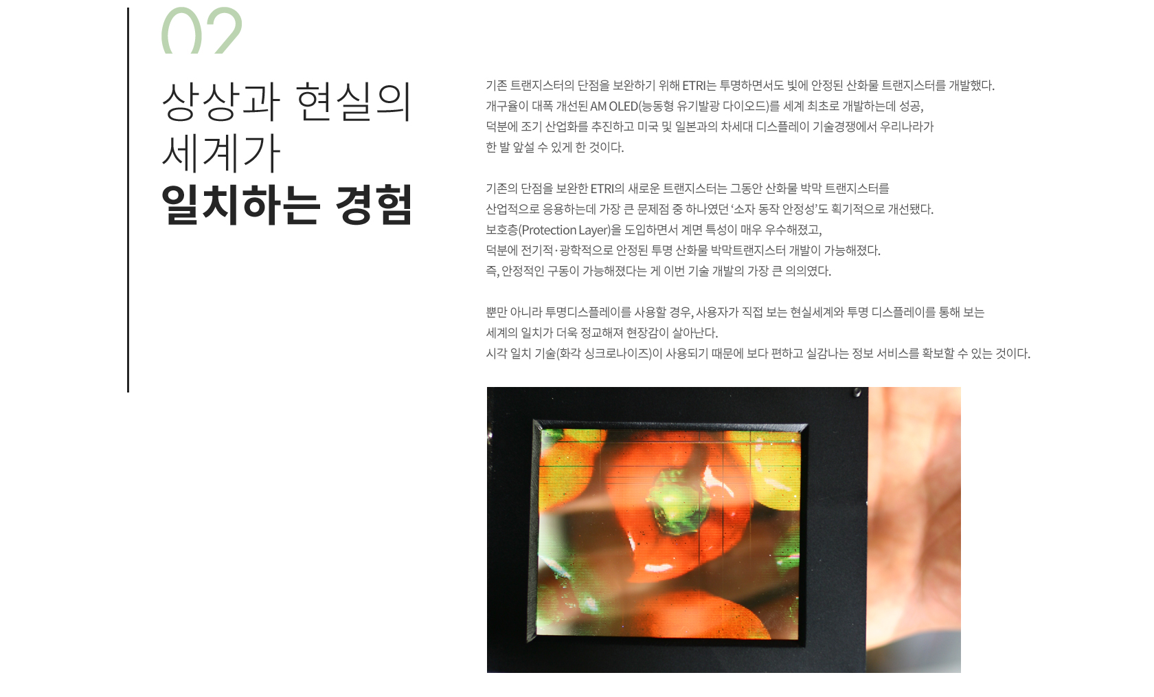 기존 트랜지스터의 단점을 보완하기 위해 ETRI는 투명하면서도 빛에 안정된 산화물 트랜지스터를 개발했다. 개구율이 대폭 개선된 AM OLED(능동형 유기발광 다이오드)를 세계 최초로 개발하는데 성공, 덕분에 조기 산업화를 추진하고 미국 및 일본과의 차세대 디스플레이 기술경쟁에서 우리나라가 한 발 앞설 수 있게 한 것이다.
