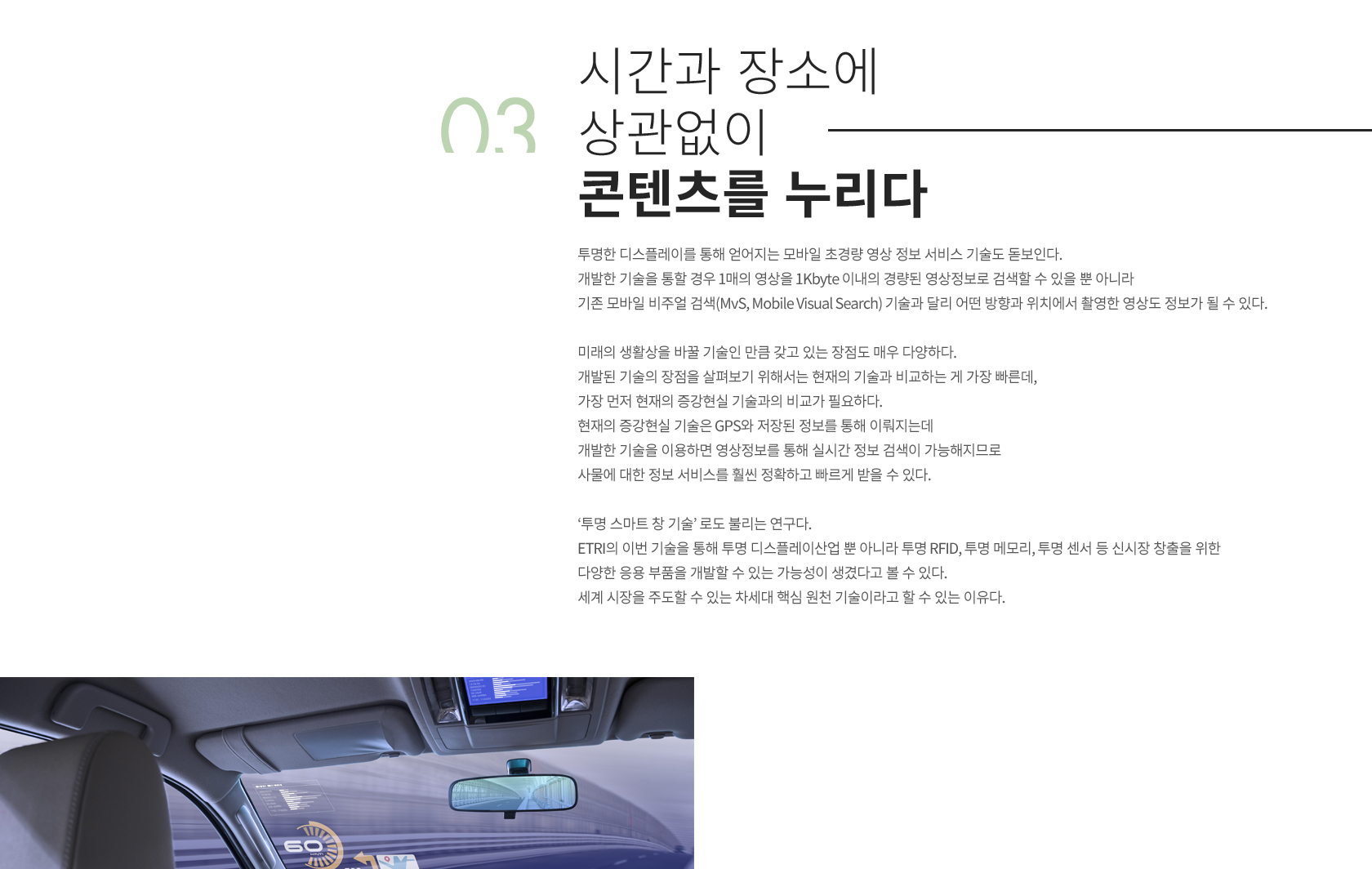 투명한 디스플레이를 통해 얻어지는 모바일 초경량 영상 정보 서비스 기술도 돋보인다. 개발한 기술을 통할 경우 1매의 영상을 1Kbyte 이내의 경량된 영상정보로 검색할 수 있을 뿐 아니라 기존 모바일 비주얼 검색(MvS, Mobile Visual Search) 기술과 달리 어떤 방향과 위치에서 촬영한 영상도 정보가 될 수 있다.