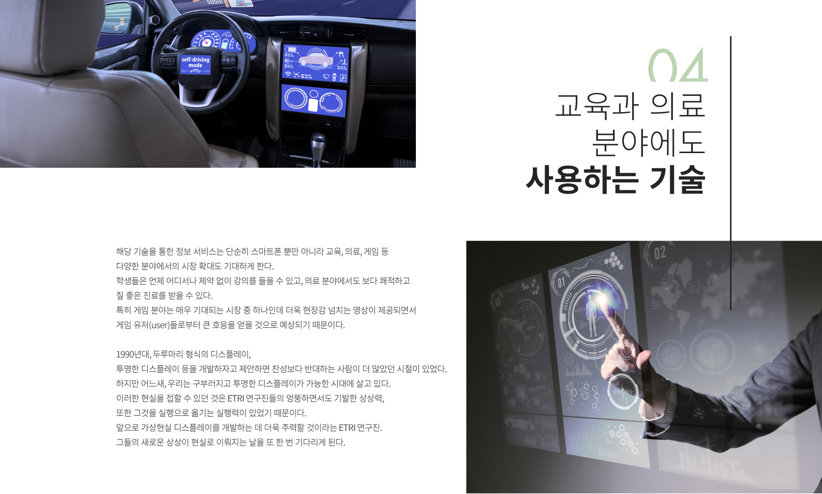 1990년대, 두루마리 형식의 디스플레이, 투명한 디스플레이 등을 개발하자고 제안하면 찬성보다 반대하는 사람이 더 많았던 시절이 있었다. 하지만 어느새, 우리는 구부러지고 투명한 디스플레이가 가능한 시대에 살고 있다. 이러한 현실을 접할 수 있던 것은 ETRI 연구진들의 엉뚱하면서도 기발한 상상력, 또한 그것을 실행으로 옮기는 실행력이 있었기 때문이다. 앞으로 가상현실 디스플레이를 개발하는 데 더욱 주력할 것이라는 ETRI 연구진. 그들의 새로운 상상이 현실로 이뤄지는 날을 또 한 번 기다리게 된다.