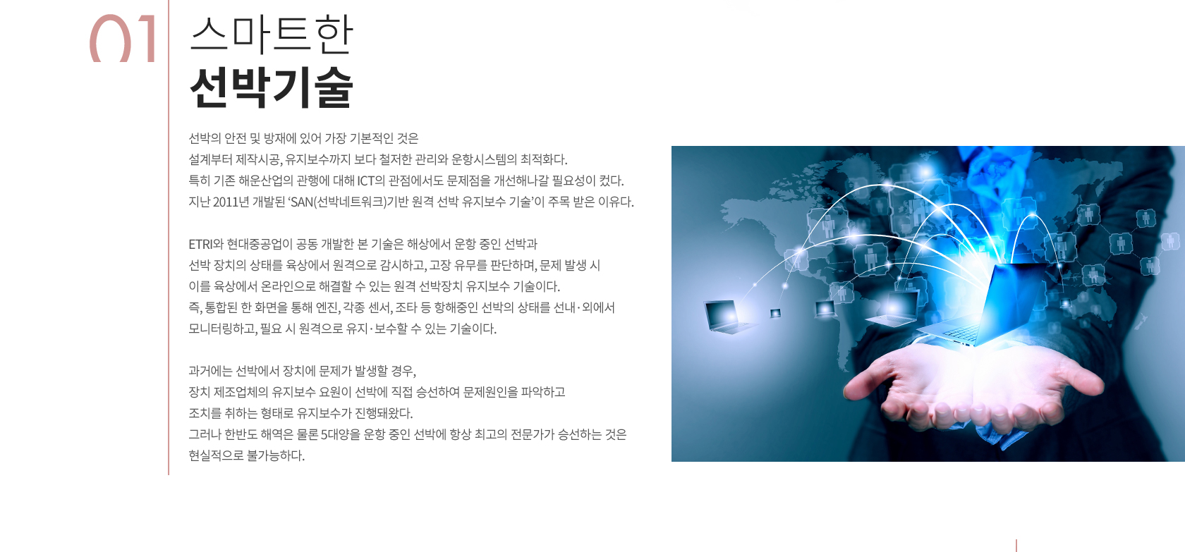 ETRI와 현대중공업이 공동 개발한 본 기술은 해상에서 운항 중인 선박과 선박 장치의 상태를 육상에서 원격으로 감시하고, 고장 유무를 판단하며, 문제 발생 시 이를 육상에서 온라인으로 해결할 수 있는 원격 선박장치 유지보수 기술이다. 즉, 통합된 한 화면을 통해 엔진, 각종 센서, 조타 등 항해중인 선박의 상태를 선내·외에서 모니터링하고, 필요 시 원격으로 유지·보수할 수 있는 기술이다.