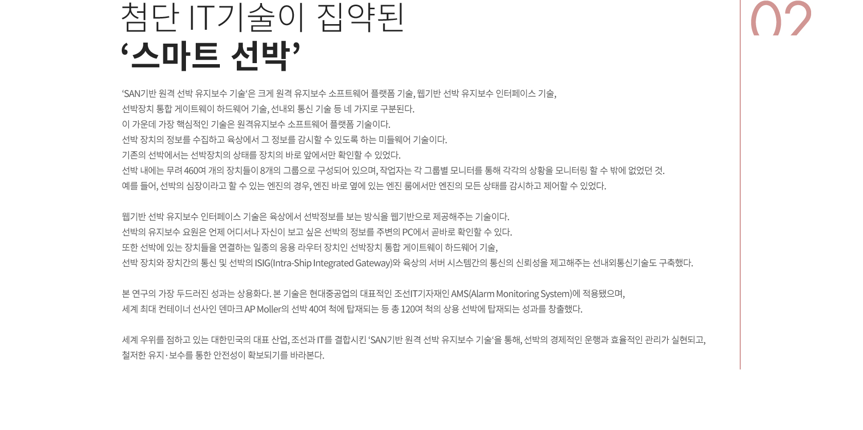 본 연구의 가장 두드러진 성과는 상용화다. 본 기술은 현대중공업의 대표적인 조선IT기자재인 AMS(Alarm Monitoring System)에 적용됐으며, 세계 최대 컨테이너 선사인 덴마크 AP Moller의 선박 40여 척에 탑재되는 등 총 120여 척의 상용 선박에 탑재되는 성과를 창출했다. 세계 우위를 점하고 있는 대한민국의 대표 산업, 조선과 IT를 결합시킨 ‘SAN기반 원격 선박 유지보수 기술‘을 통해, 선박의 경제적인 운행과 효율적인 관리가 실현되고, 철저한 유지·보수를 통한 안전성이 확보되기를 바라본다.
