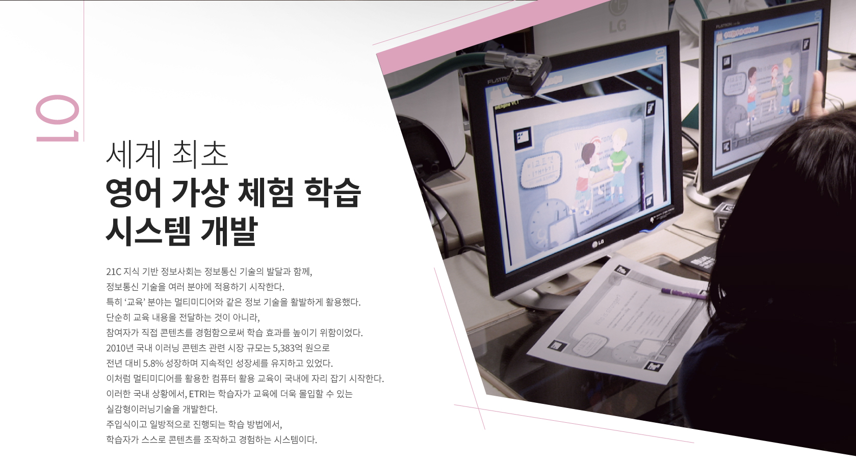 정보통신 기술이 발전하면서, 이에 따라 다양한 분야에 정보통신 기술이 접목되기 시작한다. 특히 교육분야에 멀티미디어와 같은 정보통신 기술이 접목되면서, 학습의 효과가 한 단계 더 높아진다. ETRI의 ‘실감형이러닝기술’은 교육 분야에 새로운 패러다임을 불러일으켰다.