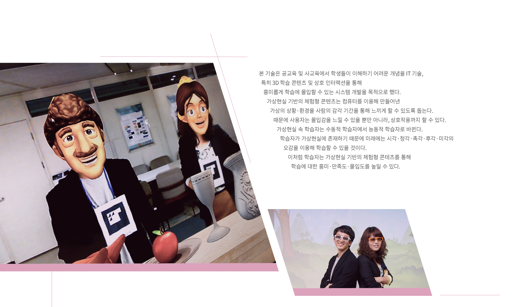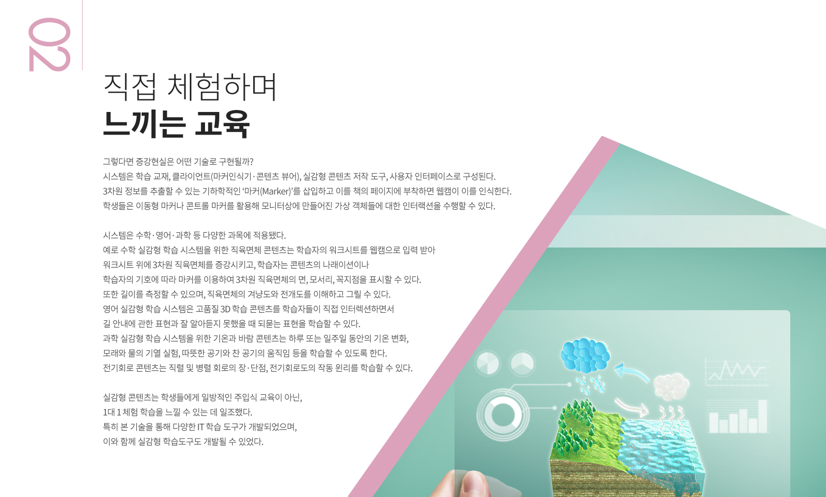 시스템은 수학·영어·과학 등 다양한 과목에 적용됐다. 예로 수학 실감형 학습 시스템을 위한 직육면체 콘텐츠는 학습자의 워크시트를 웹캠으로 입력 받아 워크시트 위에 3차원 직육면체를 증강시키고, 학습자는 콘텐츠의 나래이션이나 학습자의 기호에 따라 마커를 이용하여 3차원 직육면체의 면, 모서리, 꼭지점을 표시할 수 있다. 또한 길이를 측정할 수 있으며, 직육면체의 겨냥도와 전개도를 이해하고 그릴 수 있다. 영어 실감형 학습 시스템은 고품질 3D 학습 콘텐츠를 학습자들이 직접 인터렉션하면서 길 안내에 관한 표현과 잘 알아듣지 못했을 때 되묻는 표현을 학습할 수 있다. 과학 실감형 학습 시스템을 위한 기온과 바람 콘텐츠는 하루 또는 일주일 동안의 기온 변화, 모래와 물의 기열 실험, 따뜻한 공기와 찬 공기의 움직임 등을 학습할 수 있도록 한다. 전기회로 콘텐츠는 직렬 및 병렬 회로의 장·단점, 전기회로도의 작동 윈리를 학습할 수 있다. 실감형 콘텐츠는 학생들에게 일방적인 주입식 교육이 아닌, 1대 1 체험 학습을 느낄 수 있는 데 일조했다. 특히 본 기술을 통해 다양한 IT 학습 도구가 개발되었으며, 이와 함께 실감형 학습도구도 개발될 수 있었다.