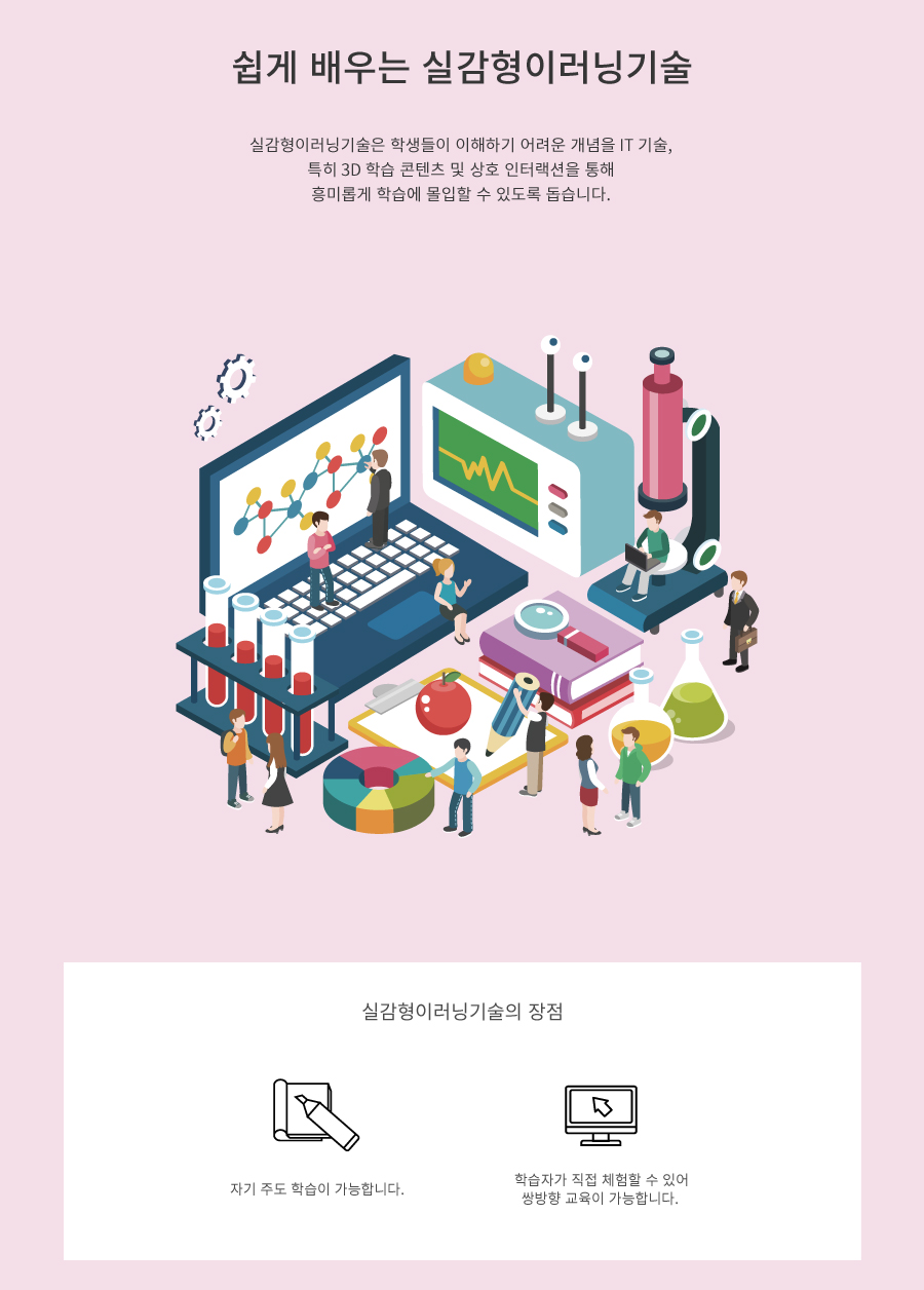 본 기술은 공교육 및 사교육에서 학생들이 이해하기 어려운 개념을 IT 기술, 특히 3D 학습 콘텐츠 및 상호 인터랙션을 통해 흥미롭게 학습에 몰입할 수 있는 시스템 개발을 목적으로 했다. 가상현실 기반의 체험형 콘텐츠는 컴퓨터를 이용해 만들어낸 가상의 상황·환경을 사람의 감각 기간을 통해 느끼게 할 수 있도록 돕는다. 때문에 사용자는 몰입감을 느낄 수 있을 뿐만 아니라, 상호작용까지 할 수 있다. 가상현실 속 학습자는 수동적 학습자에서 능동적 학습자로 바뀐다. 학습자가 가상현실에 존재하기 때문에 미래에는 시각·청각·촉각·후각·미각의 오감을 이용해 학습할 수 있을 것이다. 이처럼 학습자는 가상현실 기반의 체험형 콘테츠를 통해 학습에 대한 흥미·만족도·몰입도를 높일 수 있다.