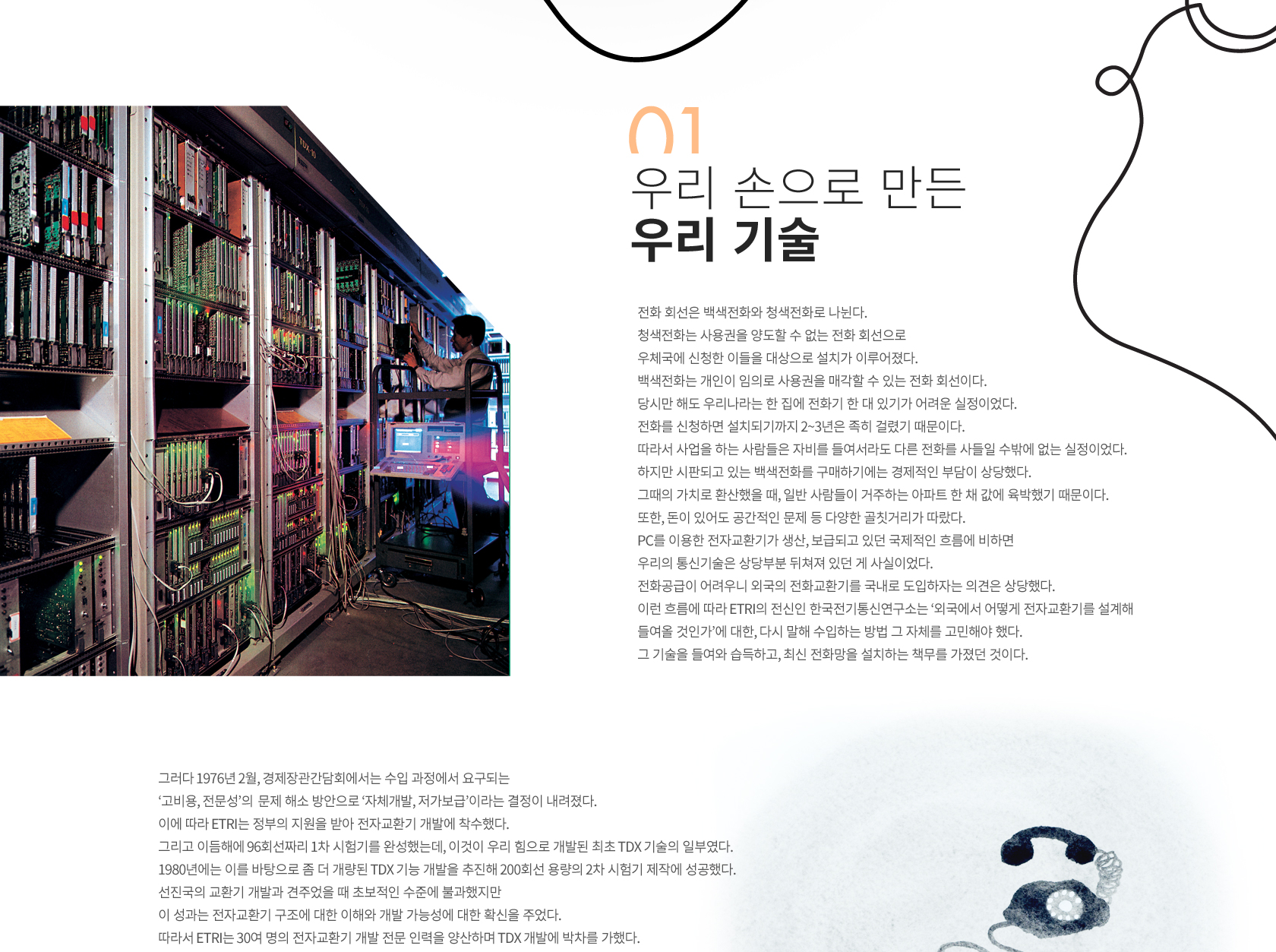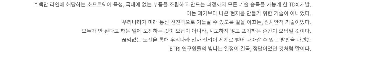 수백만 라인에 해당하는 소프트웨어 육성, 국내에 없는 부품을 조립하고 만드는 과정까지 모든 기술 습득을 가능케 한 TDX 개발. 이는 과거보다 나은 현재를 만들기 위한 기술이 아니었다. 우리나라가 미래 통신 선진국으로 거듭날 수 있도록 길을 이끄는, 원시안적 기술이었다. 모두가 안 된다고 하는 일에 도전하는 것이 오답이 아니라, 시도하지 않고 포기하는 순간이 오답일 것이다. 끊임없는 도전을 통해 우리나라 전자 산업이 세계로 뻗어 나아갈 수 있는 발판을 마련한 ETRI 연구원들의 빛나는 열정이 결국, 정답이었던 것처럼 말이다.