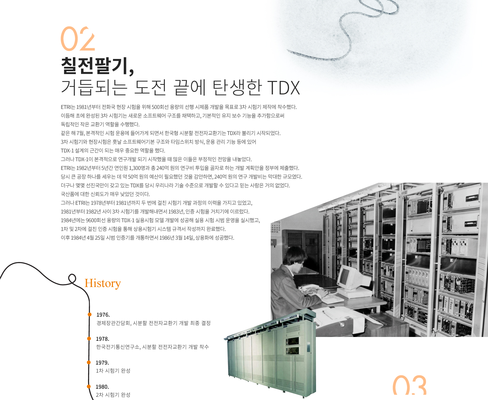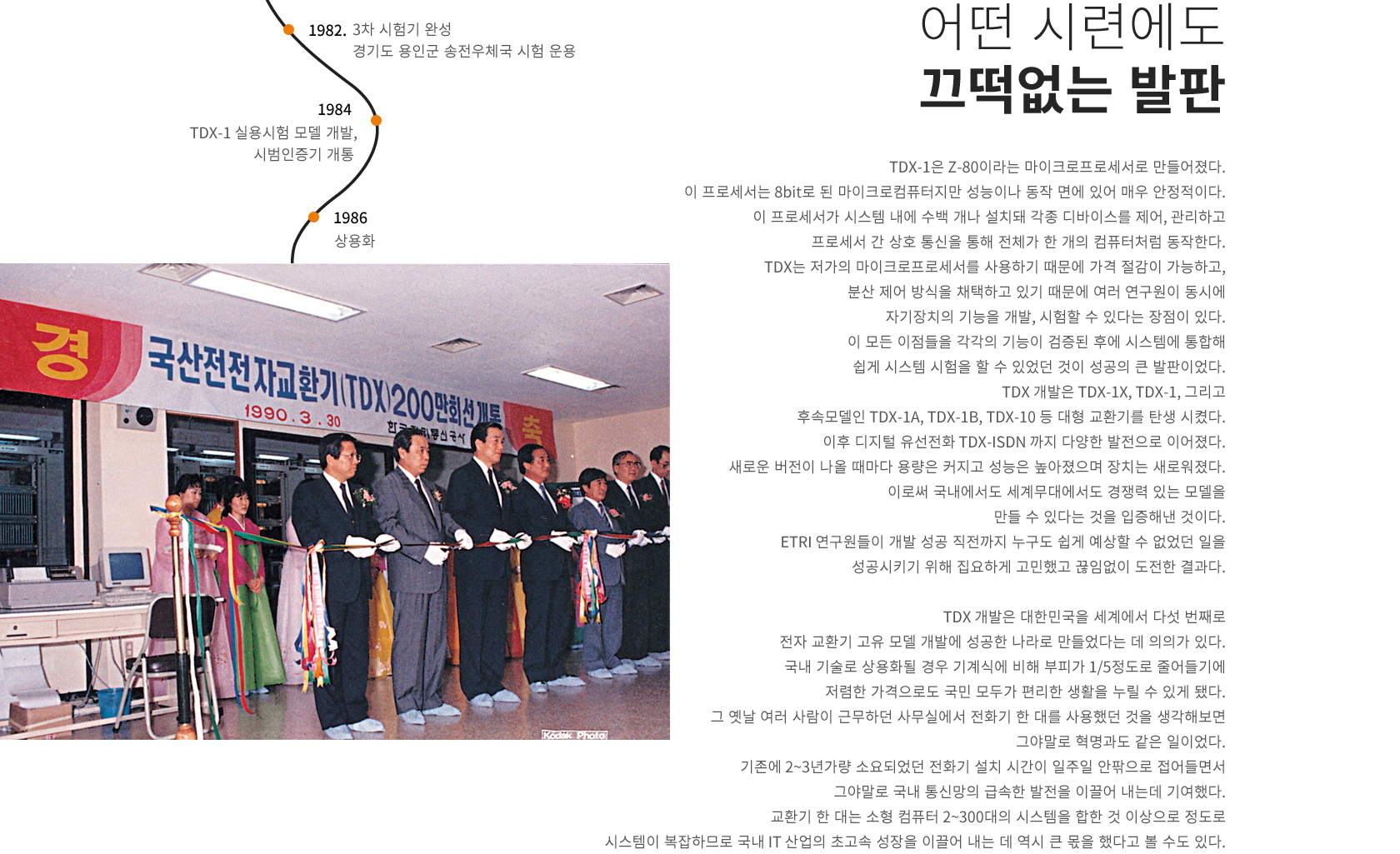 그러다 1976년 2월, 경제장관간담회에서는 수입 과정에서 요구되는 ‘고비용, 전문성’의 문제 해소 방안으로 ‘자체개발, 저가보급’이라는 결정이 내려졌다. 이에 따라 ETRI는 정부의 지원을 받아 전자교환기 개발에 착수했다. 그리고 이듬해에 96회선짜리 1차 시험기를 완성했는데, 이것이 우리 힘으로 개발된 최초 TDX 기술의 일부였다.