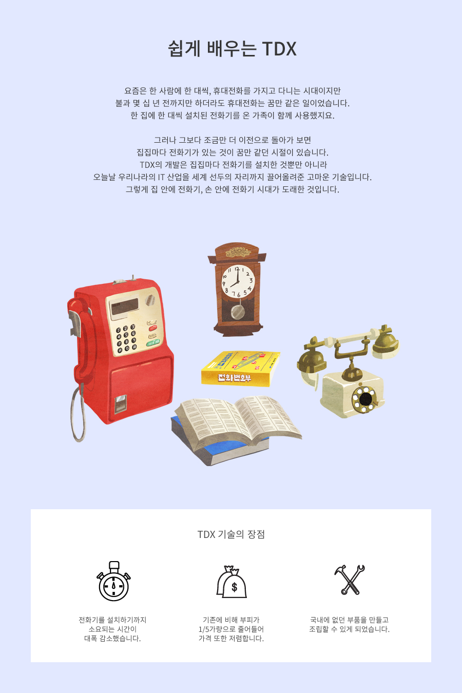 ‘TDX’는 ‘Time Division Exchange’의 약자로 ‘시분할 전전자교환기’를 의미한다. 시분할 전전자교환기는 제어계와 통화로계를 디지털화한 디지털 전전자교환기이다. 공간분할교환기에 비해 경제적이고, 우수한 통화 품질을 자랑하기도 한다.
