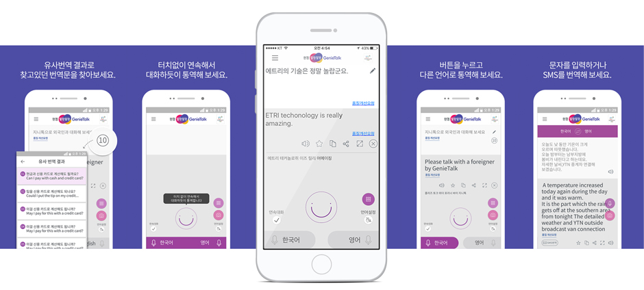 지니톡은 소프트웨어 산업원천 기술개발사업의 일환으로 ETRI가 순수 국산기술로 개발한 자동통역기술을 기반으로 만들어졌다. 현존하는 최강 통역기라 불리는 구글보다 결과물도 우수하고 편리한 사용자 인터페이스를 제공한다. 출시 100일 만에 다운로드 수가 120만 건을 돌파하는 인기 앱으로 자리매김한 지니톡. ETRI가 만들어 세계인이 함께 쓰는 지니톡의 놀라운 성능과 활용법을 면밀히 알아보자.