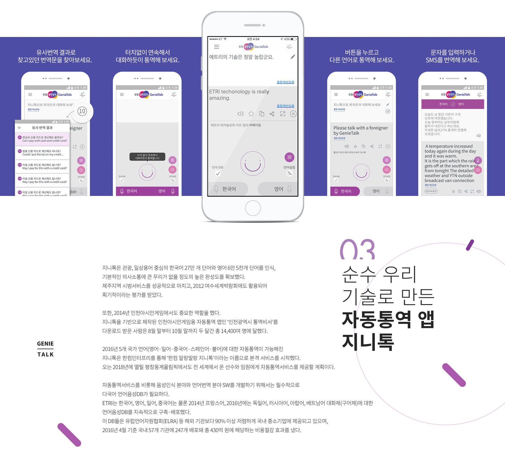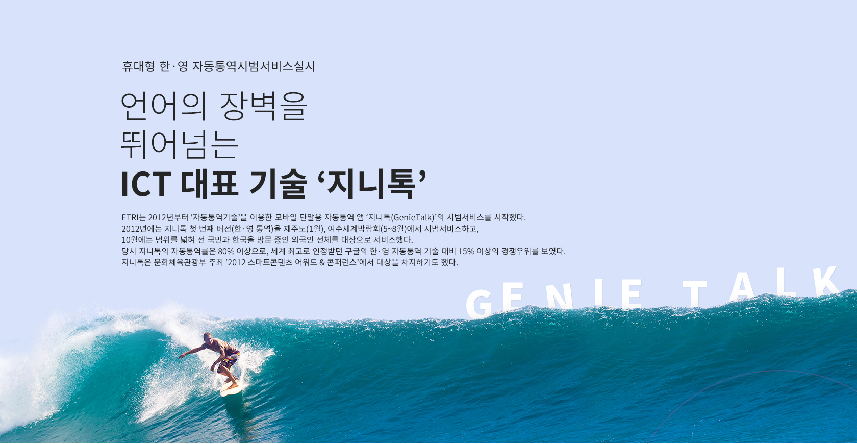 ETRI는 2012년부터 ‘자동통역기술’을 이용한 모바일 단말용 자동통역 앱 ‘지니톡(GenieTalk)’의 시범서비스를 시작했다. 2012년에는 지니톡 첫 번째 버전(한·영 통역)을 제주도(1월), 여수세계박람회(5~8월)에서 시범서비스하고, 10월에는 범위를 넓혀 전 국민과 한국을 방문 중인 외국인 전체를 대상으로 서비스했다. 당시 지니톡의 자동통역률은 80% 이상으로, 세계 최고로 인정받던 구글의 한·영 자동통역 기술 대비 15% 이상의 경쟁우위를 보였다. 지니톡은 문화체육관광부 주최 ‘2012 스마트콘텐츠 어워드 & 콘퍼런스’에서 대상을 차지하기도 했다.