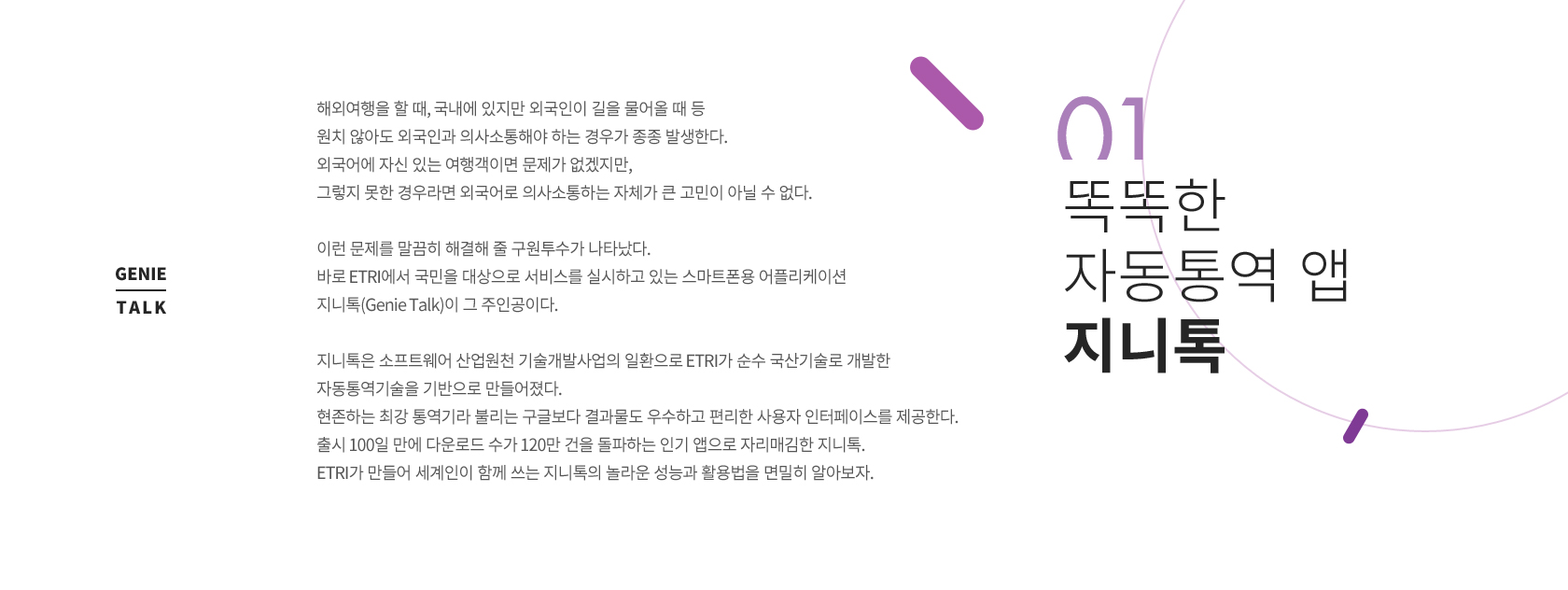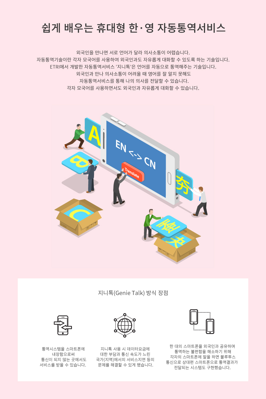 이런 문제를 말끔히 해결해 줄 구원투수가 나타났다. 바로 ETRI에서 국민을 대상으로 서비스를 실시하고 있는 스마트폰용 어플리케이션 지니톡(Genie Talk)이 그 주인공이다.