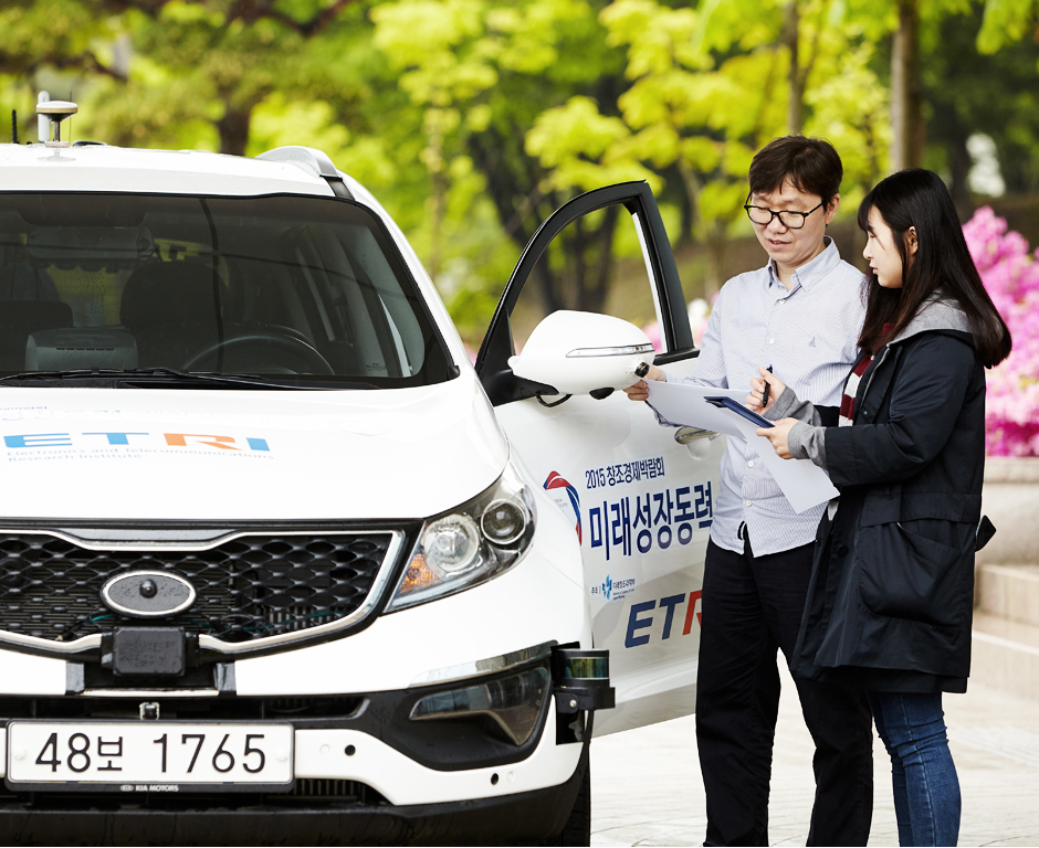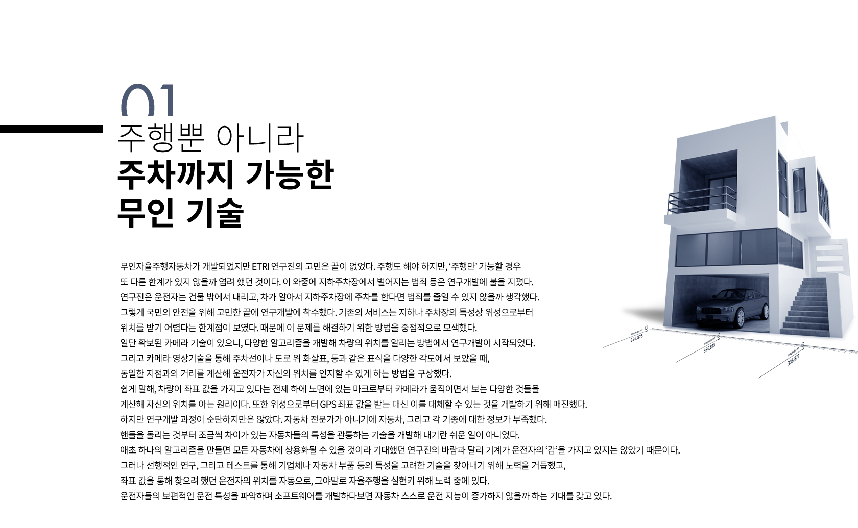 무인자율주행자동차가 개발되었지만 ETRI 연구진의 고민은 끝이 없었다. 주행도 해야 하지만, ‘주행만’ 가능할 경우 또 다른 한계가 있지 않을까 염려 했던 것이다. 이 와중에 지하주차장에서 벌어지는 범죄 등은 연구개발에 불을 지폈다. 연구진은 운전자는 건물 밖에서 내리고, 차가 알아서 지하주차장에 주차를 한다면 범죄를 줄일 수 있지 않을까 생각했다. 그렇게 국민의 안전을 위해 고민한 끝에 연구개발에 착수했다. 기존의 서비스는 지하나 주차장의 특성상 위성으로부터 위치를 받기 어렵다는 한계점이 보였다. 때문에 이 문제를 해결하기 위한 방법을 중점적으로 모색했다. 일단 확보된 카메라 기술이 있으니, 다양한 알고리즘을 개발해 차량의 위치를 알리는 방법에서 연구개발이 시작되었다. 그리고 카메라 영상기술을 통해 주차선이나 도로 위 화살표, 등과 같은 표식을 다양한 각도에서 보았을 때, 동일한 지점과의 거리를 계산해 운전자가 자신의 위치를 인지할 수 있게 하는 방법을 구상했다. 쉽게 말해, 차량이 좌표 값을 가지고 있다는 전제 하에 노면에 있는 마크로부터 카메라가 움직이면서 보는 다양한 것들을 계산해 자신의 위치를 아는 원리이다. 또한 위성으로부터 GPS 좌표 값을 받는 대신 이를 대체할 수 있는 것을 개발하기 위해 매진했다. 하지만 연구개발 과정이 순탄하지만은 않았다. 자동차 전문가가 아니기에 자동차, 그리고 각 기종에 대한 정보가 부족했다. 핸들을 돌리는 것부터 조금씩 차이가 있는 자동차들의 특성을 관통하는 기술을 개발해 내기란 쉬운 일이 아니었다. 애초 하나의 알고리즘을 만들면 모든 자동차에 상용화될 수 있을 것이라 기대했던 연구진의 바람과 달리 기계가 운전자의 ‘감’을 가지고 있지는 않았기 때문이다. 그러나 선행적인 연구, 그리고 테스트를 통해 기업체나 자동차 부품 등의 특성을 고려한 기술을 찾아내기 위해 노력을 거듭했고, 좌표 값을 통해 찾으려 했던 운전자의 위치를 자동으로, 그야말로 자율주행을 실현키 위해 노력 중에 있다. 운전자들의 보편적인 운전 특성을 파악하며 소프트웨어를 개발하다보면 자동차 스스로 운전 지능이 증가하지 않을까 하는 기대를 갖고 있다.