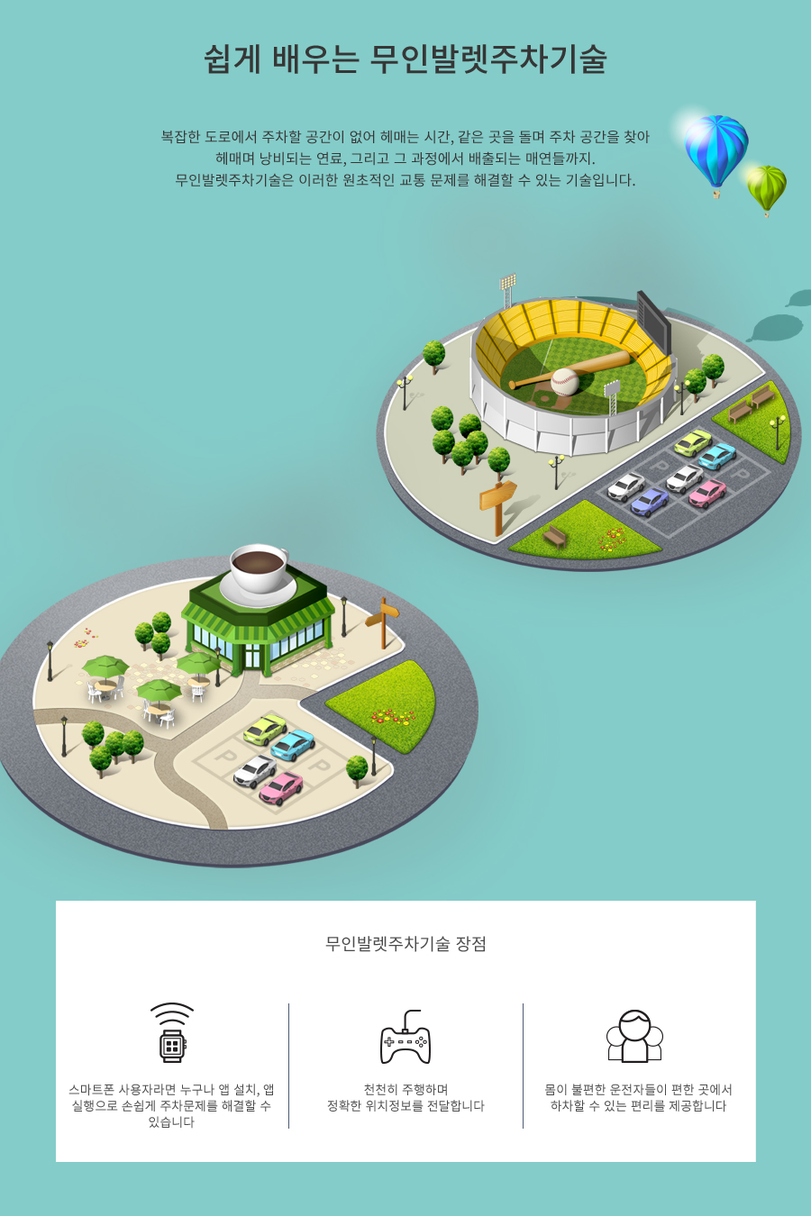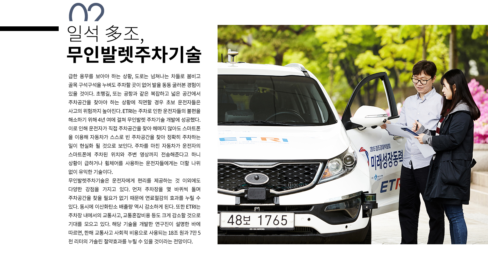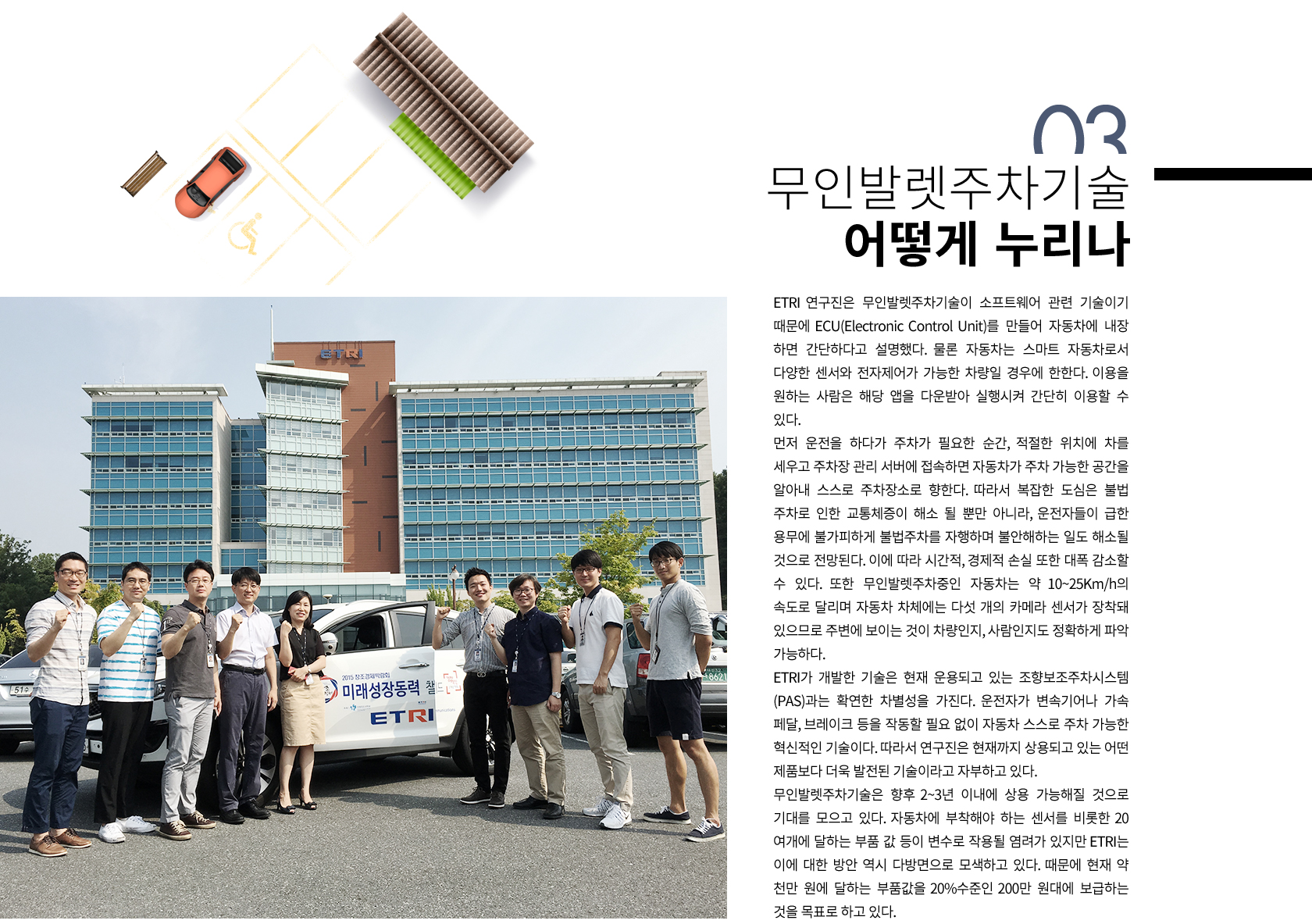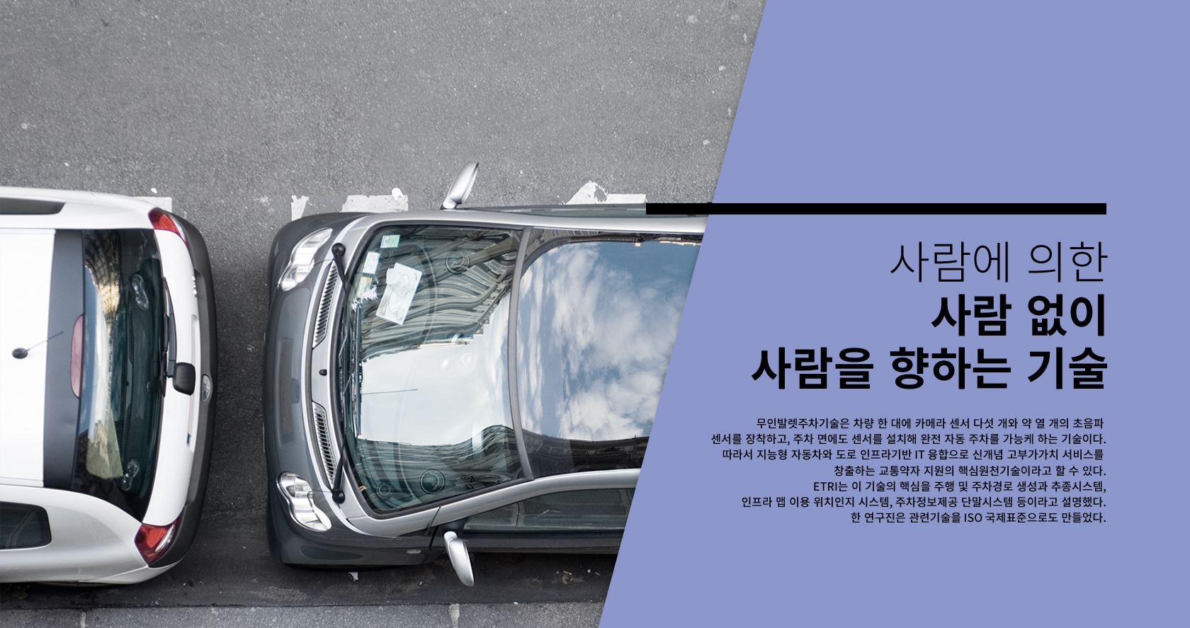 급한 용무를 보아야 하는 상황, 도로는 넘쳐나는 차들로 붐비고 골목 구석구석을 누벼도 주차할 곳이 없어 발을 동동 굴러본 경험이 있을 것이다. 초행길, 또는 공항과 같은 복잡하고 넓은 공간에서 주차공간을 찾아야 하는 상황에 직면할 경우 초보 운전자들은 사고의 위험까지 높아진다. ETRI는 주차로 인한 운전자들의 불편을 해소하기 위해 4년 여에 걸쳐 무인발렛 주차기술 개발에 성공했다. 이로 인해 운전자가 직접 주차공간을 찾아 헤매지 않아도 스마트폰 을 이용해 자동차가 스스로 빈 주차공간을 찾아 정확히 주차하는 일이 현실화 될 것으로 보인다. 주차를 마친 자동차가 운전자의 스마트폰에 주차된 위치와 주변 영상까지 전송해준다고 하니 상황이 급하거나 휠체어를 사용하는 운전자들에게는 더할 나위 없이 유익한 기술이다.