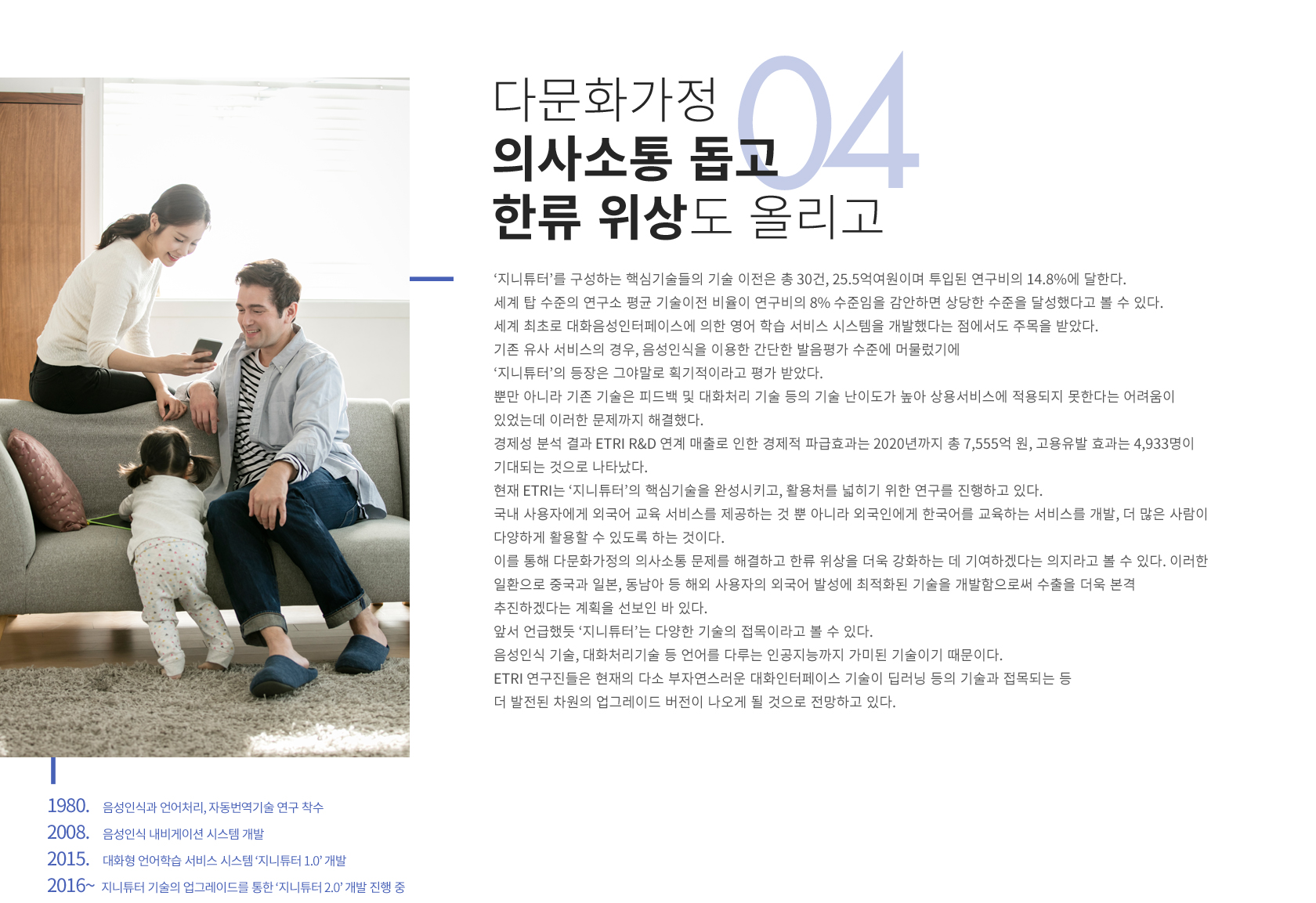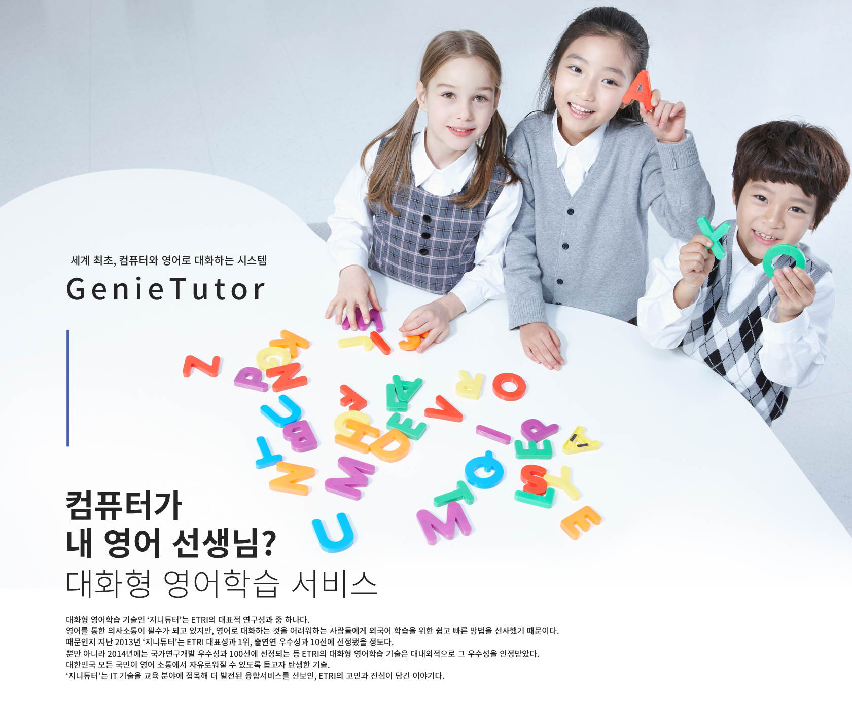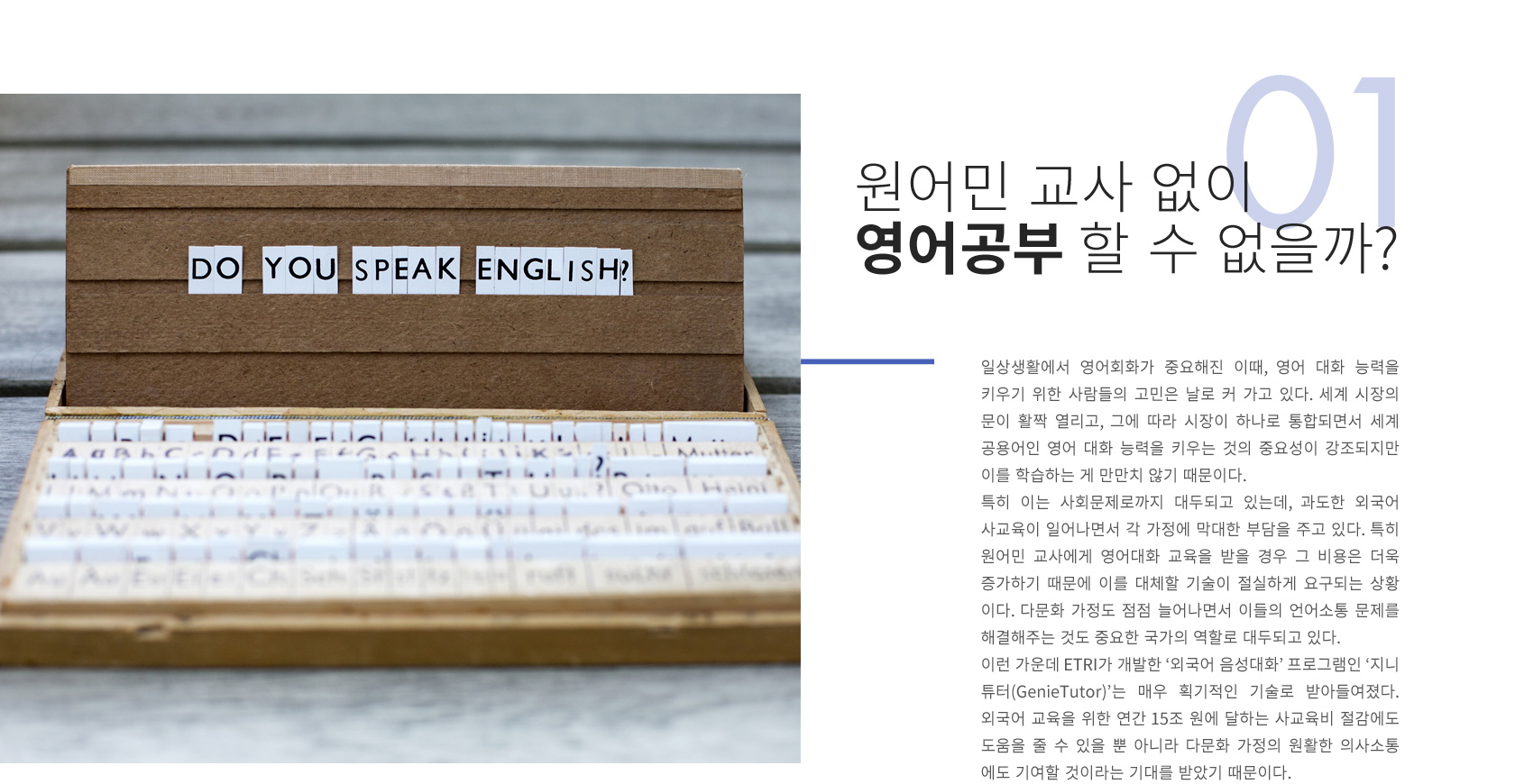대화형 영어학습 기술인 ‘지니튜터’는 ETRI의 대표적 연구성과 중 하나다. 영어를 통한 의사소통이 필수가 되고 있지만, 영어로 대화하는 것을 어려워하는 사람들에게 외국어 학습을 위한 쉽고 빠른 방법을 선사했기 때문이다. 때문인지 지난 2013년 ‘지니튜터’는 ETRI 대표성과 1위, 출연연 우수성과 10선에 선정됐을 정도다. 뿐만 아니라 2014년에는 국가연구개발 우수성과 100선에 선정되는 등 ETRI의 대화형 영어학습 기술은 대내외적으로 그 우수성을 인정받았다. 대한민국 모든 국민이 영어 소통에서 자유로워질 수 있도록 돕고자 탄생한 기술. ‘지니튜터’는 IT 기술을 교육 분야에 접목해 더 발전된 융합서비스를 선보인, ETRI의 고민과 진심이 담긴 이야기다.
