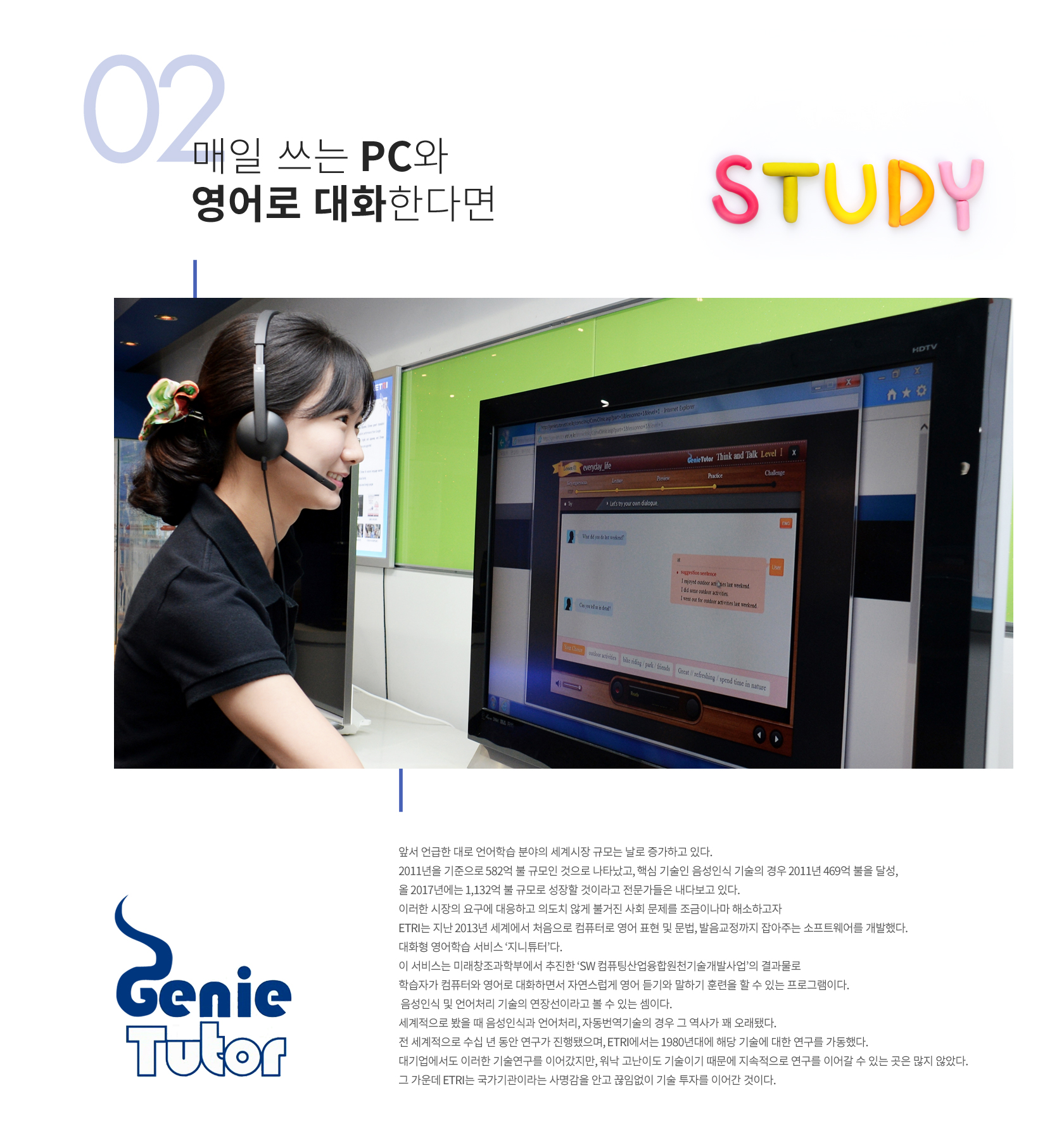 이런 가운데 ETRI가 개발한 ‘외국어 음성대화’ 프로그램인 ‘지니 튜터(GenieTutor)’는 매우 획기적인 기술로 받아들여졌다. 외국어 교육을 위한 연간 15조 원에 달하는 사교육비 절감에도 도움을 줄 수 있을 뿐 아니라 다문화 가정의 원활한 의사소통 에도 기여할 것이라는 기대를 받았기 때문이다.