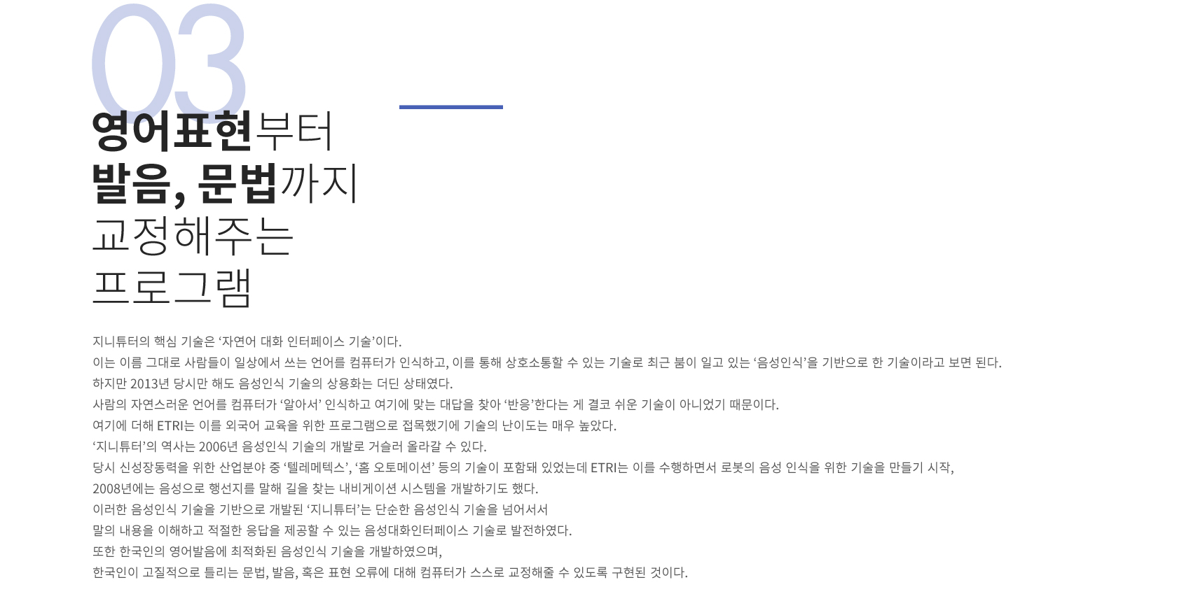 대화형 영어학습 서비스 ‘지니튜터’다. 이 서비스는 미래창조과학부에서 추진한 ‘SW 컴퓨팅산업융합원천기술개발사업’의 결과물로 학습자가 컴퓨터와 영어로 대화하면서 자연스럽게 영어 듣기와 말하기 훈련을 할 수 있는 프로그램이다. 음성인식 및 언어처리 기술의 연장선이라고 볼 수 있는 셈이다. 세계적으로 봤을 때 음성인식과 언어처리, 자동번역기술의 경우 그 역사가 꽤 오래됐다. 전 세계적으로 수십 년 동안 연구가 진행됐으며, ETRI에서는 1980년대에 해당 기술에 대한 연구를 가동했다. 대기업에서도 이러한 기술연구를 이어갔지만, 워낙 고난이도 기술이기 때문에 지속적으로 연구를 이어갈 수 있는 곳은 많지 않았다. 그 가운데 ETRI는 국가기관이라는 사명감을 안고 끊임없이 기술 투자를 이어간 것이다.