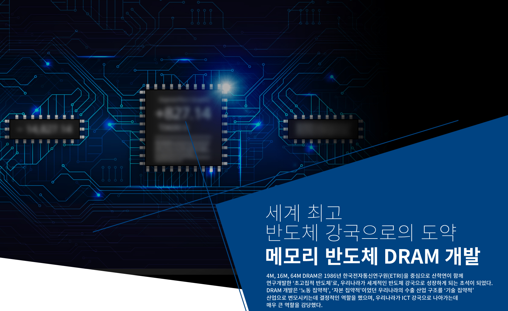 4M, 16M, 64M DRAM은 1986년 한국전자통신연구원(ETRI)을 중심으로 산학연이 함께 연구개발한 ‘초고집적 반도체’로, 우리나라가 세계적인 반도체 강국으로 성장하게 되는 초석이 되었다.