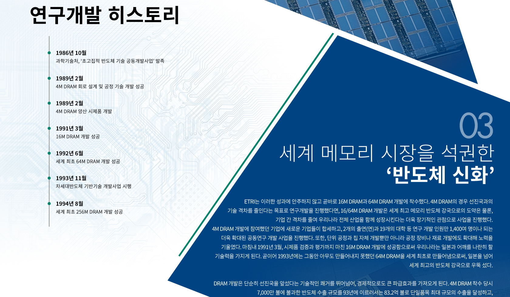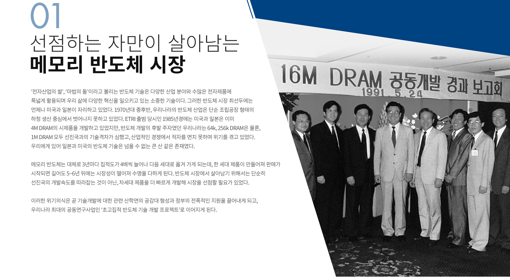 ‘전자산업의 쌀’, ‘마법의 돌’이라고 불리는 반도체 기술은 다양한 산업 분야와 수많은 전자제품에 폭넓게 활용되며 우리 삶에 다양한 혁신을 일으키고 있는 소중한 기술이다. 그러한 반도체 시장 최선두에는 언제나 미국과 일본이 자리하고 있었다. 1970년대 중후반, 우리나라의 반도체 산업은 단순 조립공장 형태의 하청 생산 중심에서 벗어나지 못하고 있었다. ETRI 출범 당시인 1985년경에는 미국과 일본은 이미 4M DRAM의 시제품을 개발하고 있었지만, 반도체 개발의 후발 주자였던 우리나라는 64k, 256k DRAM은 물론, 1M DRAM 모두 선진국과의 기술격차가 심했고, 산업적인 경쟁에서 적자를 면치 못하며 위기를 겪고 있었다. 우리에게 있어 일본과 미국의 반도체 기술은 넘을 수 없는 큰 산 같은 존재였다.