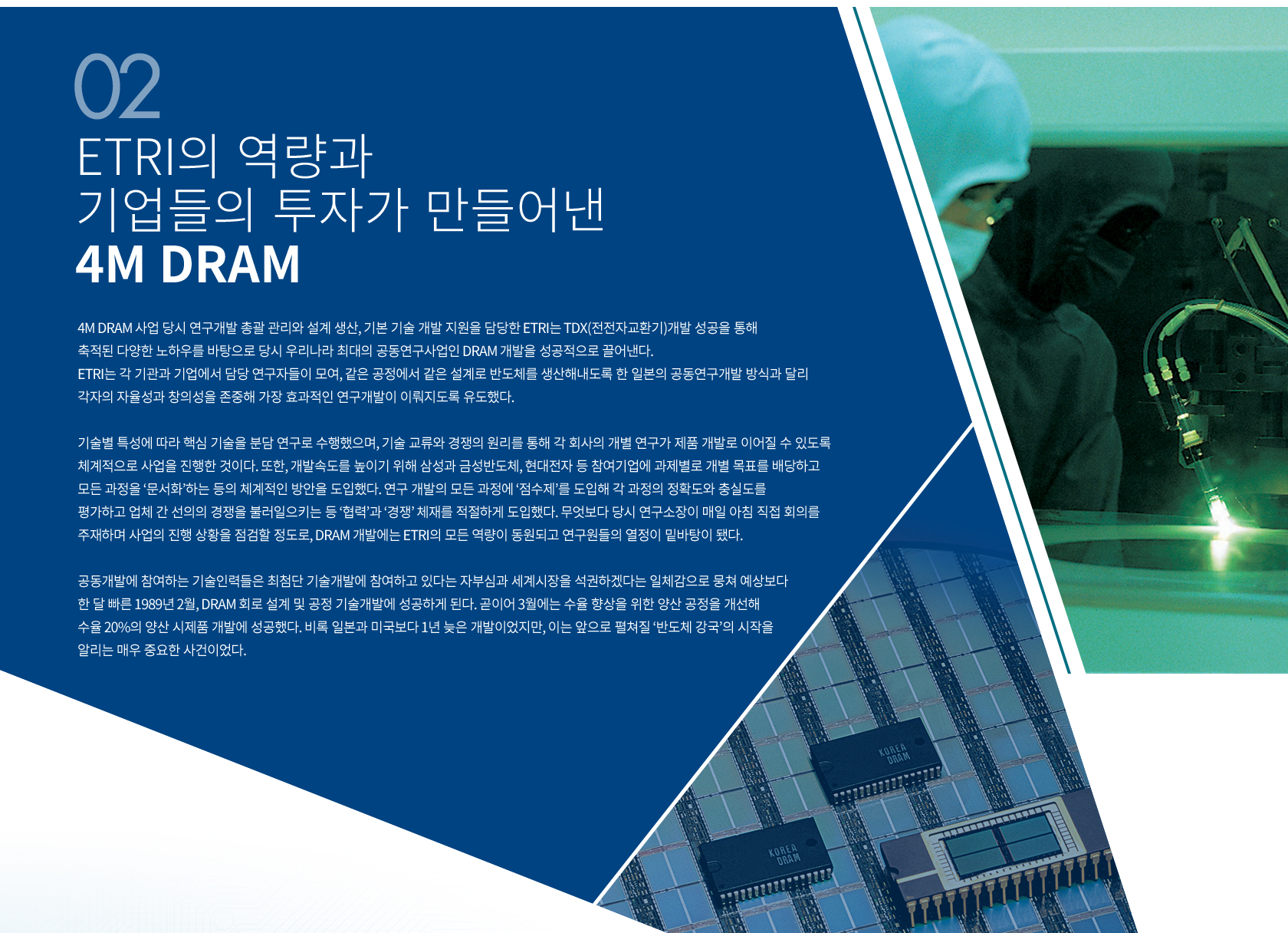 4M DRAM 사업 당시 연구개발 총괄 관리와 설계 생산, 기본 기술 개발 지원을 담당한 ETRI는 TDX(전전자교환기)개발 성공을 통해 축적된 다양한 노하우를 바탕으로 당시 우리나라 최대의 공동연구사업인 DRAM 개발을 성공적으로 끌어낸다.