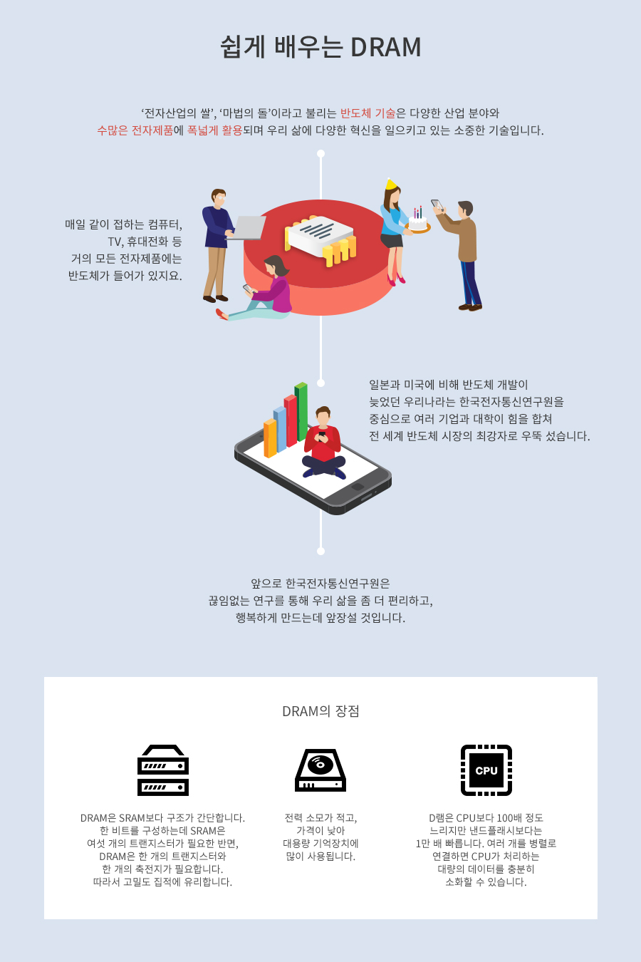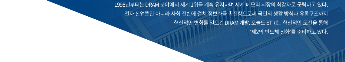 전자 산업뿐만 아니라 사회 전반에 걸쳐 정보화를 촉진함으로써 국민의 생활 방식과 유통구조까지 혁신적인 변화를 일으킨 DRAM 개발. 오늘도 ETRI는 혁신적인 도전을 통해 ‘제2의 반도체 신화’를 준비하고 있다.