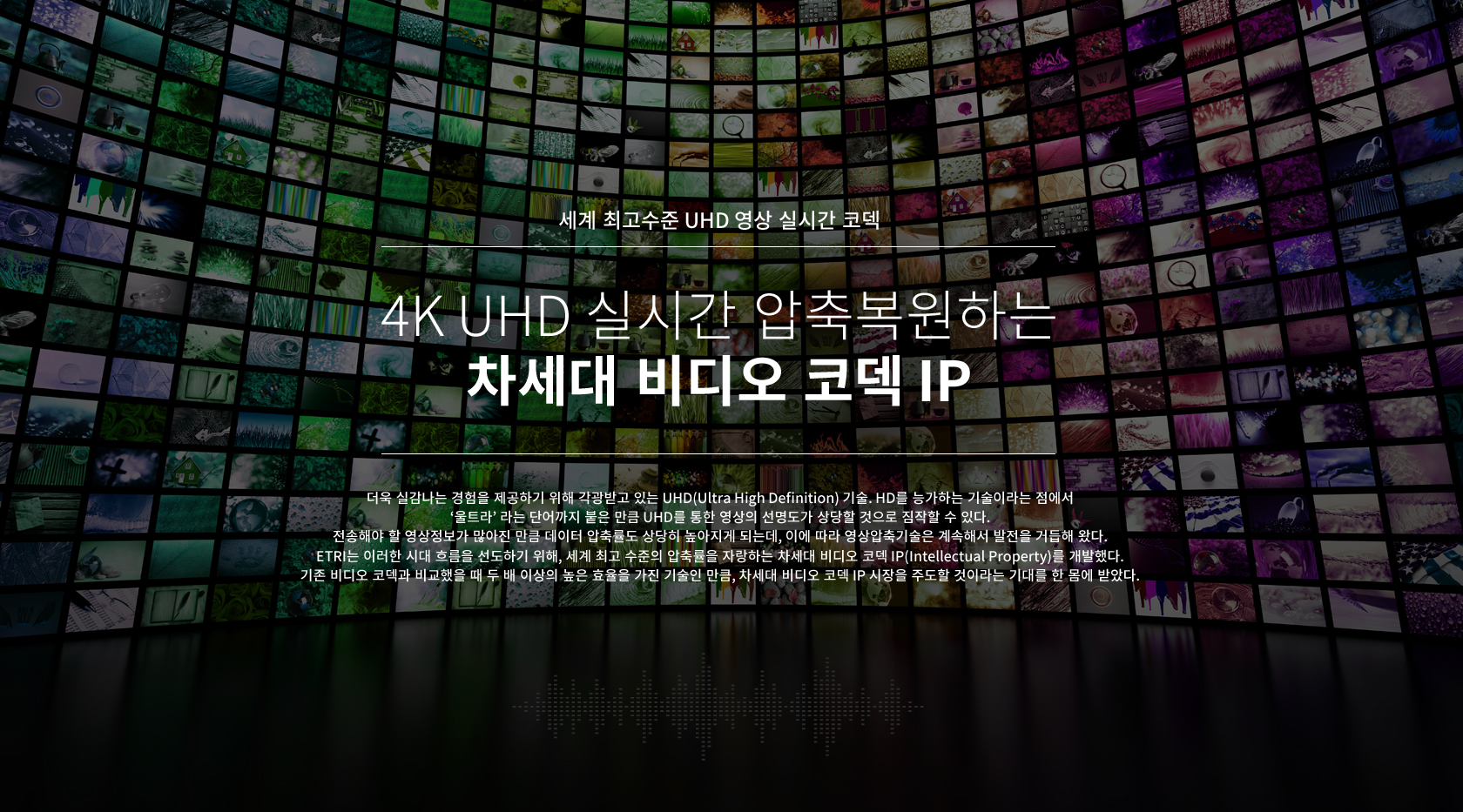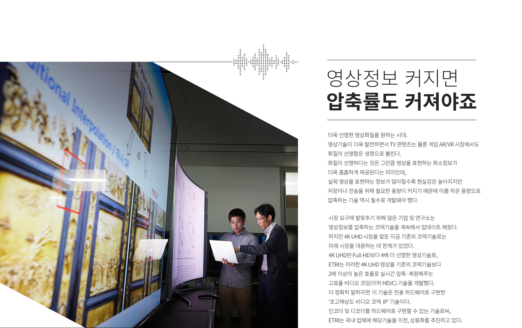 더욱 실감나는 경험을 제공하기 위해 각광받고 있는 UHD(Ultra High Definition) 기술. HD를 능가하는 기술이라는 점에서 ‘울트라’ 라는 단어까지 붙은 만큼 UHD를 통한 영상의 선명도가 상당할 것으로 짐작할 수 있다. 전송해야 할 영상정보가 많아진 만큼 데이터 압축률도 상당히 높아지게 되는데, 이에 따라 영상압축기술은 계속해서 발전을 거듭해 왔다. ETRI는 이러한 시대 흐름을 선도하기 위해, 세계 최고 수준의 압축률을 자랑하는 차세대 비디오 코덱 IP(Intellectual Property)를 개발했다. 기존 비디오 코덱과 비교했을 때 두 배 이상의 높은 효율을 가진 기술인 만큼, 차세대 비디오 코덱 IP 시장을 주도할 것이라는 기대를 한 몸에 받았다.