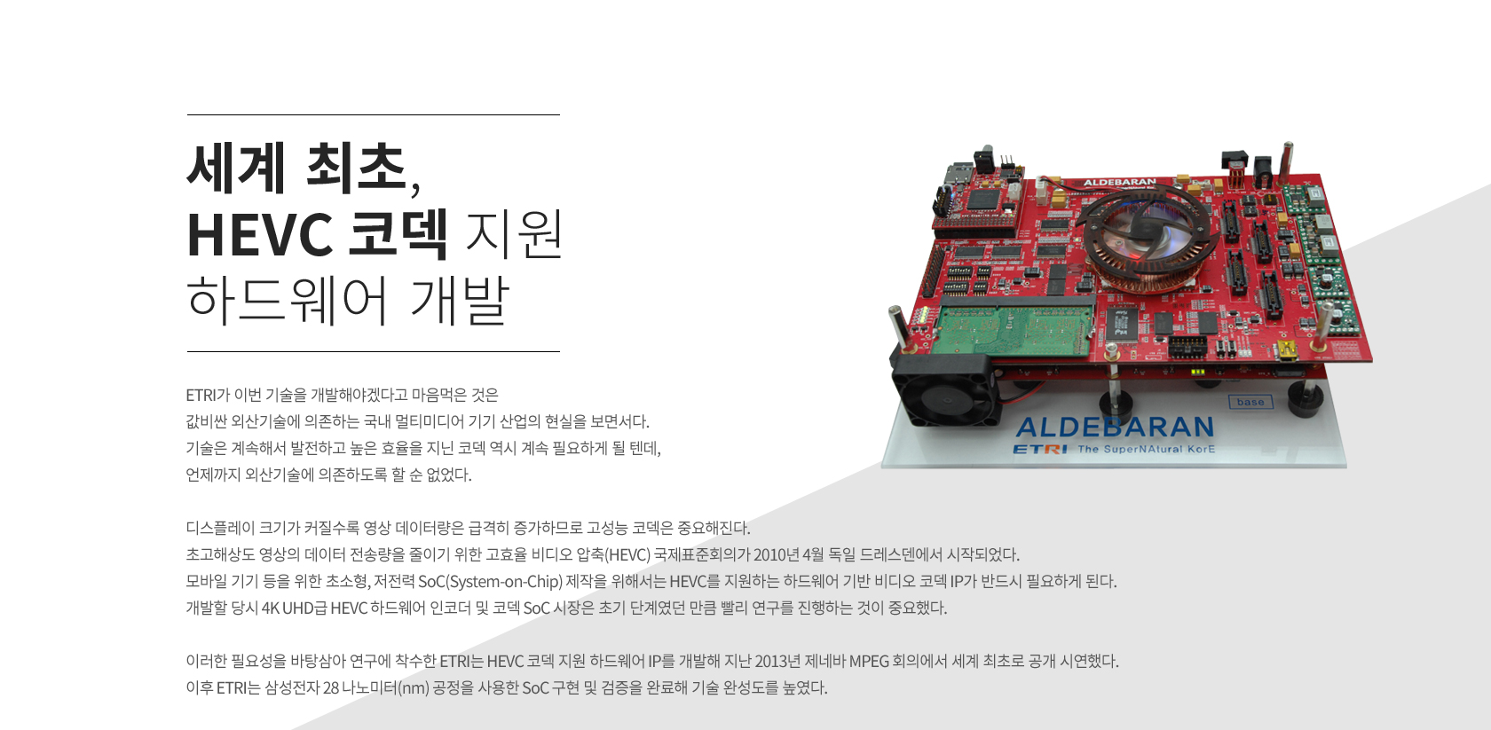 이러한 필요성을 바탕삼아 연구에 착수한 ETRI는 HEVC 코덱 지원 하드웨어 IP를 개발해 지난 2013년 제네바 MPEG 회의에서 세계 최초로 공개 시연했다. 이후 ETRI는 삼성전자 28 나노미터(nm) 공정을 사용한 SoC 구현 및 검증을 완료해 기술 완성도를 높였다.
