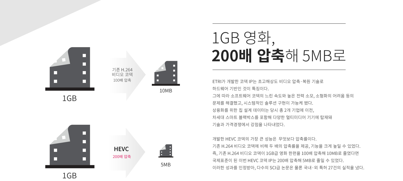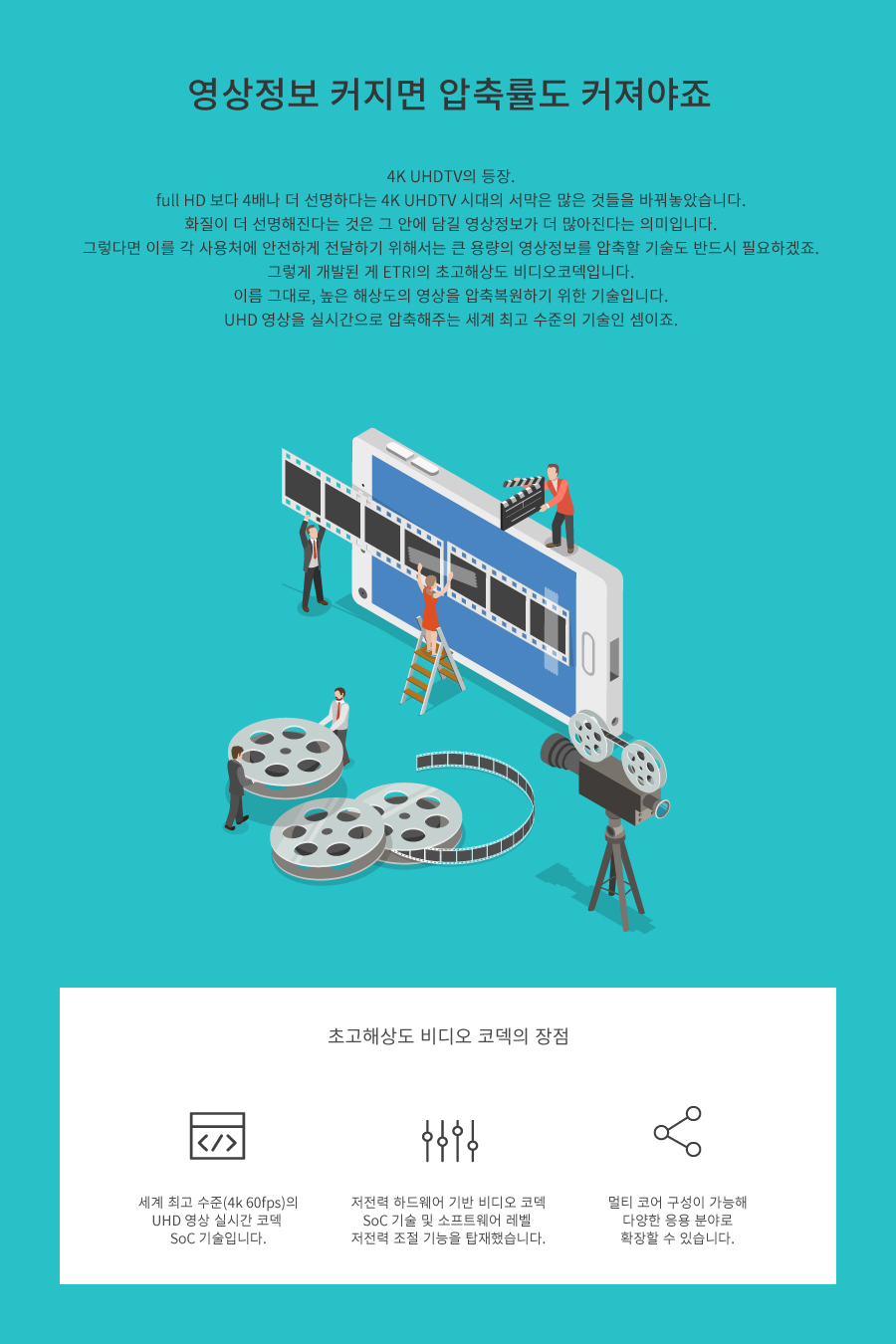 시장 요구에 발맞추기 위해 많은 기업 및 연구소는 영상정보를 압축하는 코덱기술을 계속해서 업데이트 해왔다. 하지만 4K UHD 시장을 앞둔 지금 기존의 코덱기술로는 미래 시장을 대응하는 데 한계가 있었다. 4K UHD란 Full-HD보다 4배 더 선명한 영상기술로, ETRI는 이러한 4K UHD 영상을 기존의 코덱기술보다 2배 이상의 높은 효율로 실시간 압축·복원해주는 고효율 비디오 코딩(이하 HEVC) 기술을 개발했다. 더 정확히 말하자면 이 기술은 전용 하드웨어로 구현한 ‘초고해상도 비디오 코덱 IP’ 기술이다. 인코더 및 디코더를 하드웨어로 구현할 수 있는 기술로써, ETRI는 국내 업체에 해당기술을 이전, 상용화를 추진하고 있다.
