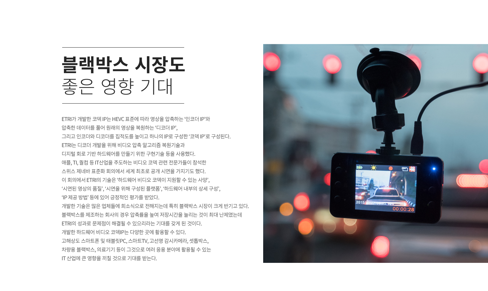 ETRI가 개발한 코덱 IP는 초고해상도 비디오 압축·복원 기술로 하드웨어 기반인 것이 특징이다. 그에 따라 소프트웨어 코덱의 느린 속도와 높은 전력 소모, 소형화의 어려움 등의 문제를 해결했고, 시스템적인 솔루션 구현이 가능케 됐다. 상용화를 위한 칩 설계 데이터는 당시 총 2개 기업에 이전, 차세대 스마트 블랙박스를 포함해 다양한 멀티미디어 기기에 탑재돼 기술과 가격경쟁에서 강점을 나타내었다.