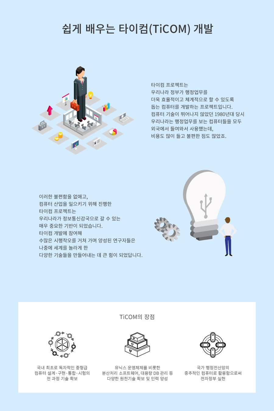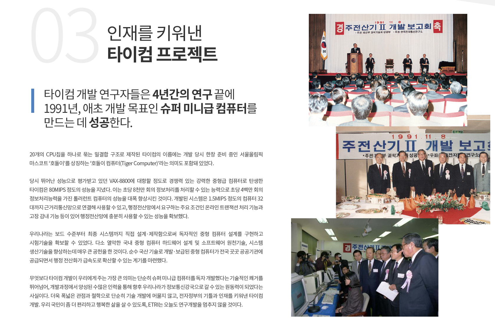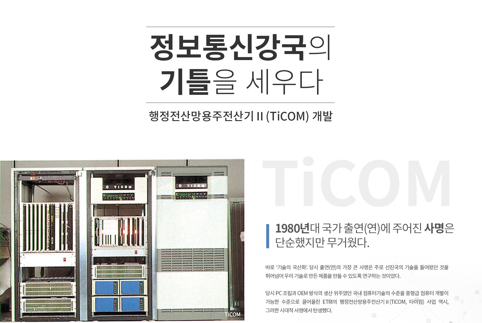 당시 출연(연)의 가장 큰 사명은 주로 선진국의 기술을 들여왔던 것을 뛰어넘어 우리 기술로 만든 제품을 만들 수 있도록 연구하는 것이었다. 당시 PC 조립과 OEM 방식의 생산 위주였던 국내 컴퓨터기술의 수준을 중형급 컴퓨터 개발이 가능한 수준으로 끌어올린 ETRI의 행정전산망용주전산기Ⅱ(TiCOM, 타이컴) 사업 역시, 그러한 시대적 사명에서 탄생했다.