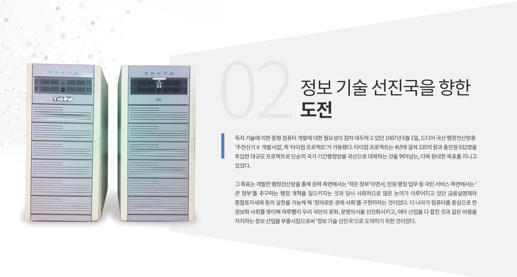 독자 기술에 의한 중형 컴퓨터 개발에 대한 필요성이 점차 대두하고 있던 1987년 6월 1일, 드디어 국산 행정전산망용 ‘주전산기Ⅱ 개발사업’, 즉 ‘타이컴 프로젝트’가 가동됐다. 타이컴 프로젝트는 4년에 걸쳐 335억 원과 총인원 932명을 투입한 대규모 프로젝트로 단순히 국가 기간행정망을 국산으로 대체하는 것을 뛰어넘는, 더욱 원대한 목표를 지니고 있었다.