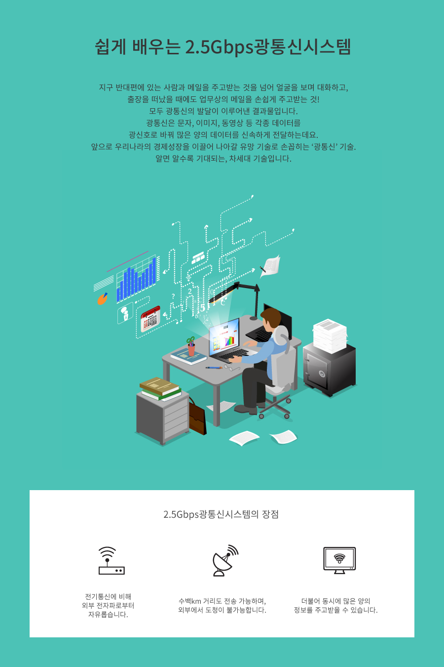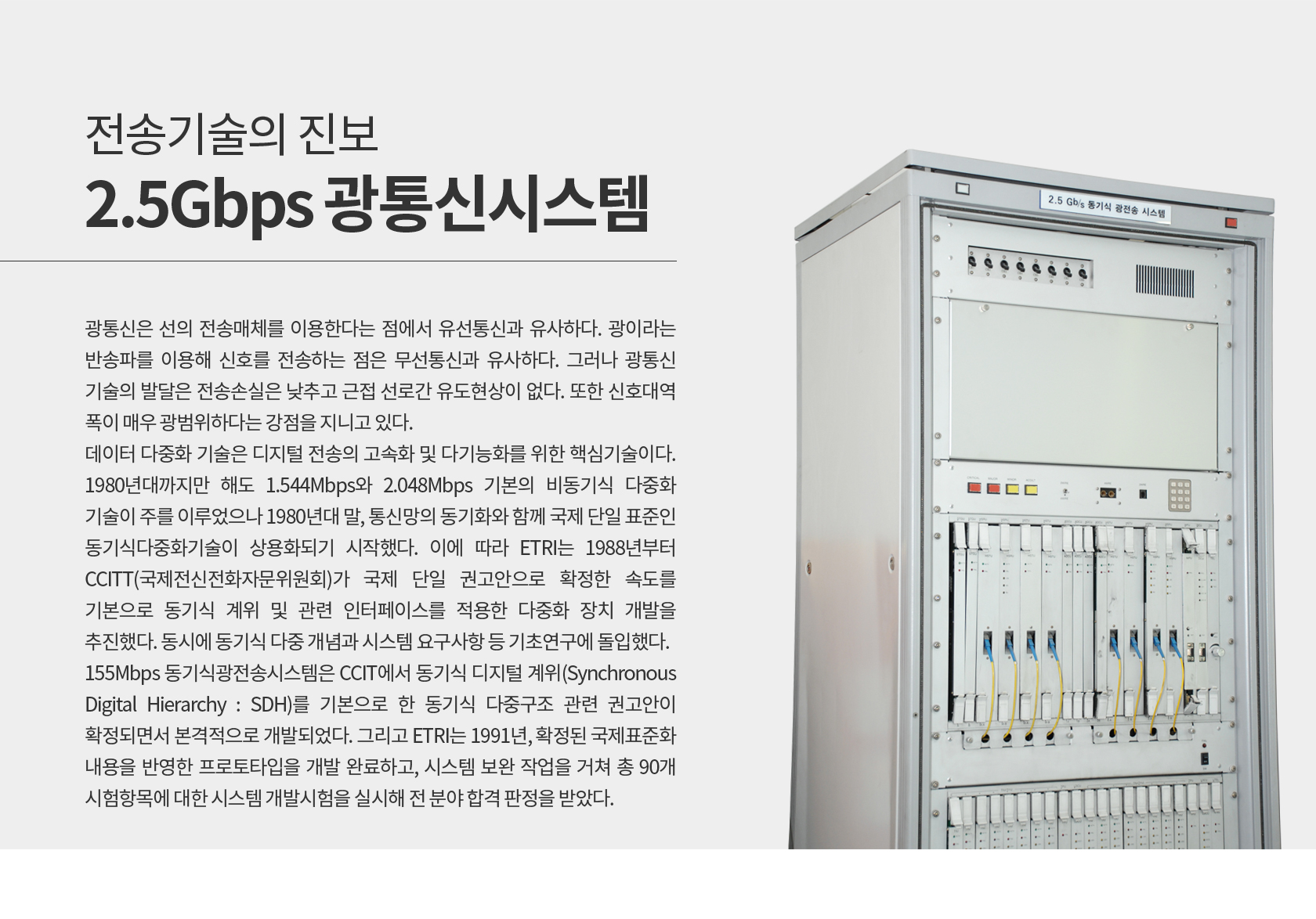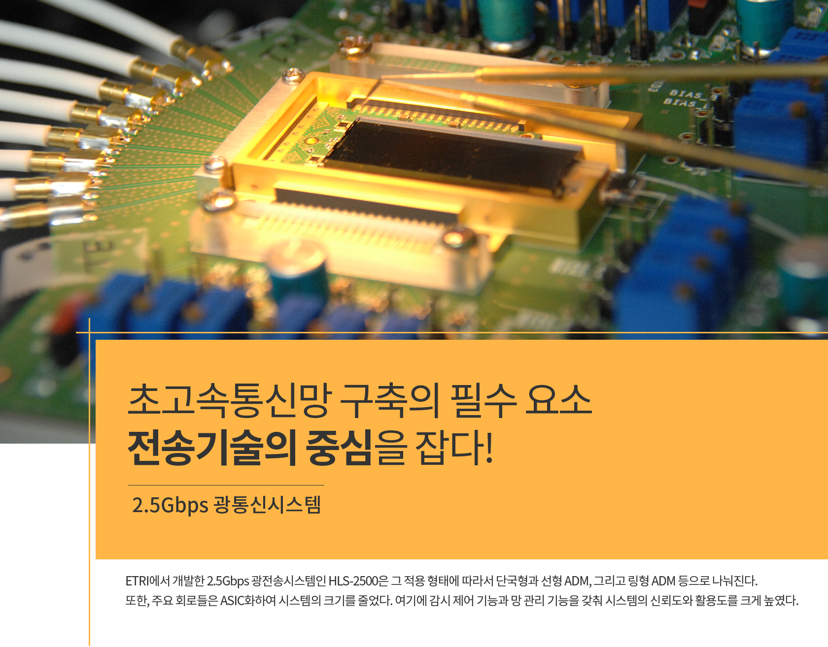 ETRI 연구원들의 광통신시스템에 대한 연구개발은 무한했다. 더 신속하고, 풍족하고, 광범위한 기술을 요구하는 오늘날, 2.5Gbps 광통신시스템 개발은 어떤 의미일까. 정보를 주고받는 경로에 고속도로가 생긴 것이다. ETRI 연구원들의 연구개발은 우리는 더 빠르게, 먼 곳으로 안내하고 있다.