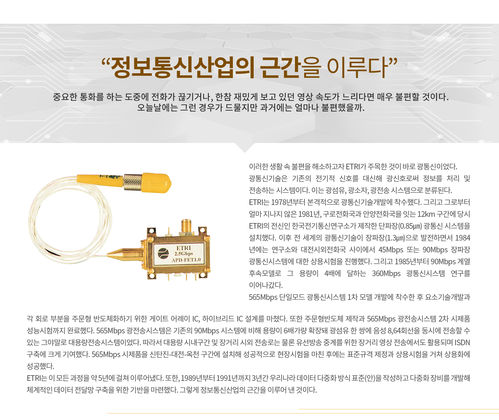 ETRI는 1978년부터 본격적으로 광통신기술개발에 착수했다. 그리고 그로부터 얼마 지나지 않은 1981년, 구로전화국과 안양전화국을 잇는 12km 구간에 당시 ETRI의 전신인 한국전기통신연구소가 제작한 단파장(0.85㎛) 광통신 시스템을 설치했다. 이후 전 세계의 광통신기술이 장파장(1.3㎛)으로 발전하면서 1984년에는 연구소와 대전시외전화국 사이에서 45Mbps 또는 90Mbps 장파장 광통신시스템에 대한 상용시험을 진행했다. 그리고 1985년부터는 90Mbps 계열 후속모델로 그 용량이 4배에 달하는 360Mbps 광통신시스템 연구를 이어나갔다.