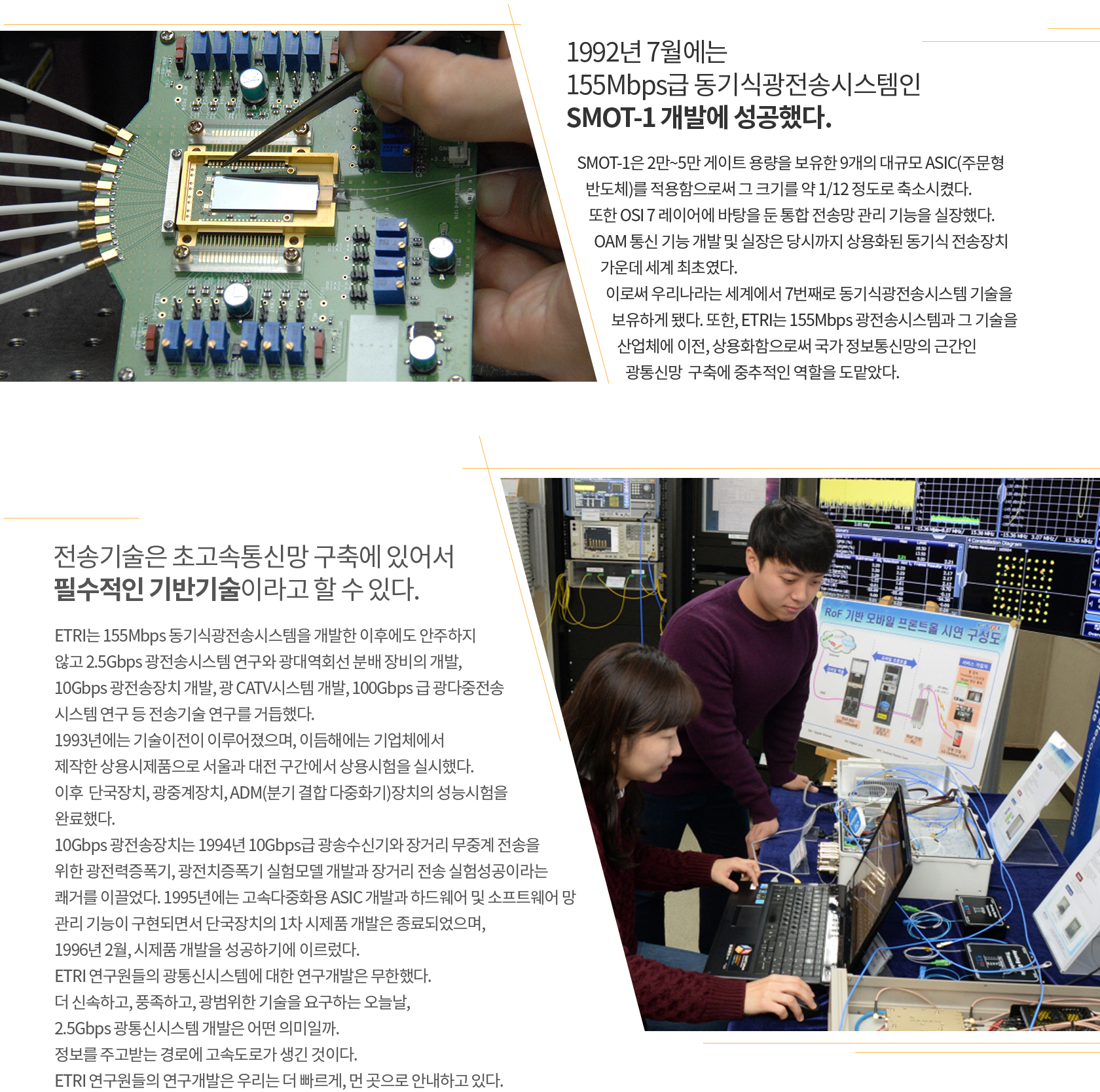 1992년 7월에는 155Mbps급 동기식광전송시스템인 SMOT-1 개발에 성공했다. SMOT-1은 2만~5만 게이트 용량을 보유한 9개의 대규모 ASIC(주문형 반도체)를 적용함으로써 그 크기를 약 1/12 정도로 축소시켰다. 또한 OSI 7 레이어에 바탕을 둔 통합 전송망 관리 기능을 실장했다. OAM 통신 기능 개발 및 실장은 당시까지 상용화된 동기식 전송장치 가운데 세계 최초였다. 이로써 우리나라는 세계에서 7번째로 동기식광전송시스템 기술을 보유하게 됐다. 또한, ETRI는 155Mbps 광전송시스템과 그 기술을 산업체에 이전, 상용화함으로써 국가 정보통신망의 근간인 광통신망 구축에 중추적인 역할을 도맡았다.