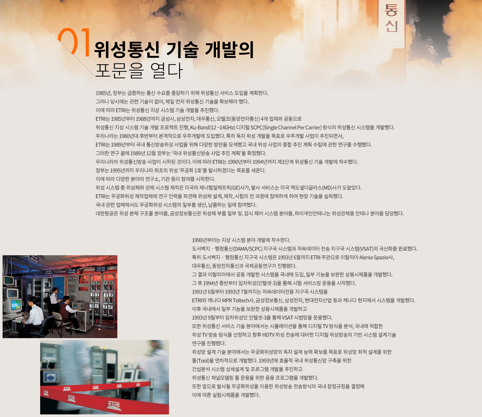 우리나라는 1980년대 후반부터 본격적으로 우주개발에 도입했다. 특히 독자 위성 개발을 목표로 우주개발 사업이 추진되면서, ETRI는 1989년부터 국내 통신방송위성 사업을 위해 다양한 방안을 모색했고 국내 위성 사업의 종합 추진 계획 수립에 관한 연구를 수행했다. 그러한 연구 끝에 1989년 12월 정부는 ‘국내 위성통신방송 사업 추진 계획’을 확정했다. 우리나라의 위성통신방송 사업이 시작된 것이다. 이에 따라 ETRI는 1990년부터 1994년까지 제1단계 위성통신 기술 개발에 착수했다.