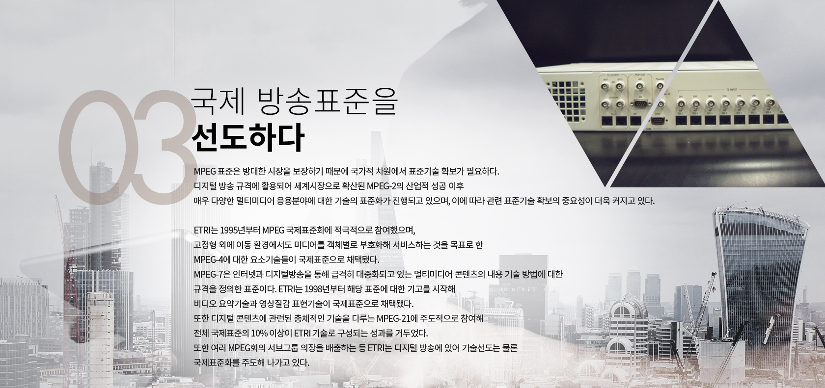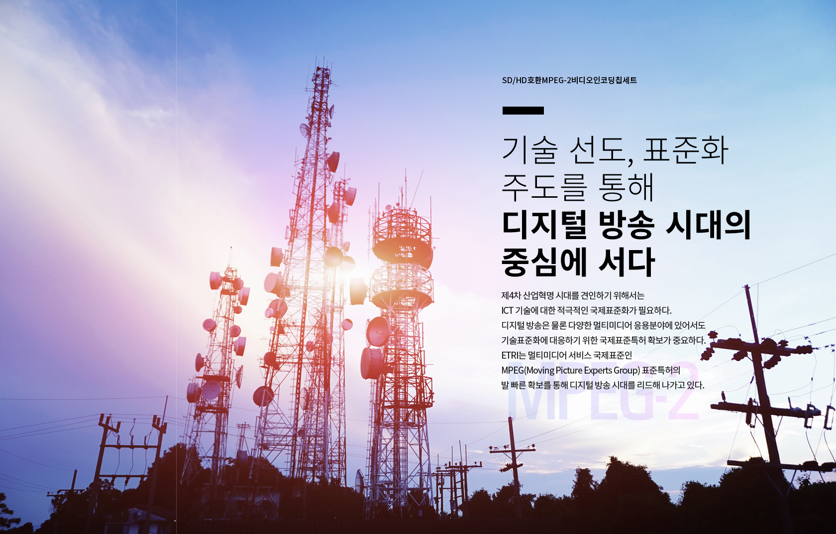 ETRI는 멀티미디어 서비스 국제표준인 MPEG(Moving Picture Experts Group) 표준특허의 발 빠른 확보를 통해 디지털 방송 시대를 리드해 나가고 있다.