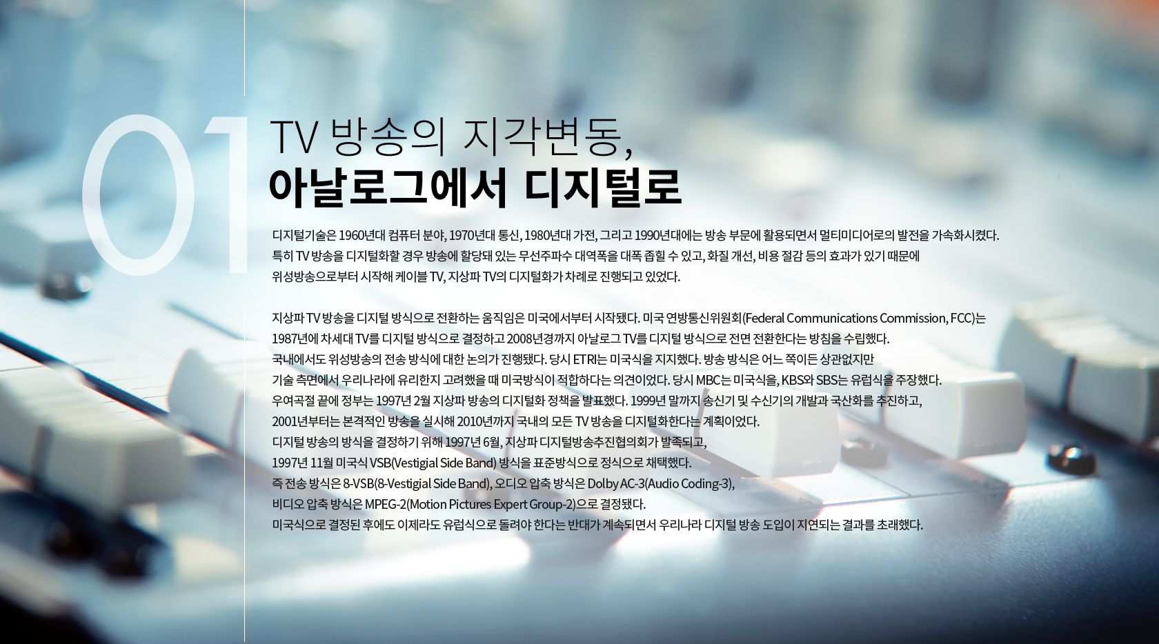 디지털기술은 1960년대 컴퓨터 분야, 1970년대 통신, 1980년대 가전, 그리고 1990년대에는 방송 부문에 활용되면서 멀티미디어로의 발전을 가속화시켰다. 특히 TV 방송을 디지털화할 경우 방송에 할당돼 있는 무선주파수 대역폭을 대폭 좁힐 수 있고, 화질 개선, 비용 절감 등의 효과가 있기 때문에 위성방송으로부터 시작해 케이블 TV, 지상파 TV의 디지털화가 차례로 진행되고 있었다.
