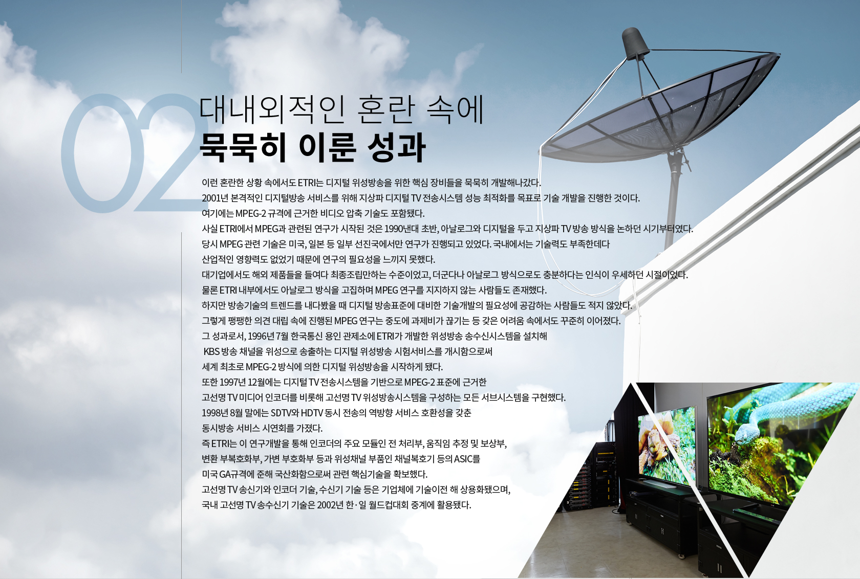 이런 혼란한 상황 속에서도 ETRI는 디지털 위성방송을 위한 핵심 장비들을 묵묵히 개발해나갔다. 2001년 본격적인 디지털방송 서비스를 위해 지상파 디지털 TV 전송시스템 성능 최적화를 목표로 기술 개발을 진행한 것이다. 여기에는 MPEG-2 규격에 근거한 비디오 압축 기술도 포함됐다. 사실 ETRI에서 MPEG과 관련된 연구가 시작된 것은 1990낸대 초반, 아날로그와 디지털을 두고 지상파 TV 방송 방식을 논하던 시기부터였다. 당시 MPEG 관련 기술은 미국, 일본 등 일부 선진국에서만 연구가 진행되고 있었다. 국내에서는 기술력도 부족한데다 산업적인 영향력도 없었기 때문에 연구의 필요성을 느끼지 못했다. 대기업에서도 해외 제품들을 들여다 최종조립만하는 수준이었고, 더군다나 아날로그 방식으로도 충분하다는 인식이 우세하던 시절이었다. 물론 ETRI 내부에서도 아날로그 방식을 고집하며 MPEG 연구를 지지하지 않는 사람들도 존재했다. 하지만 방송기술의 트렌드를 내다봤을 때 디지털 방송표준에 대비한 기술개발의 필요성에 공감하는 사람들도 적지 않았다. 그렇게 팽팽한 의견 대립 속에 진행된 MPEG 연구는 중도에 과제비가 끊기는 등 갖은 어려움 속에서도 꾸준히 이어졌다.