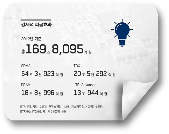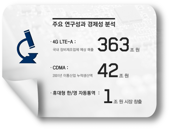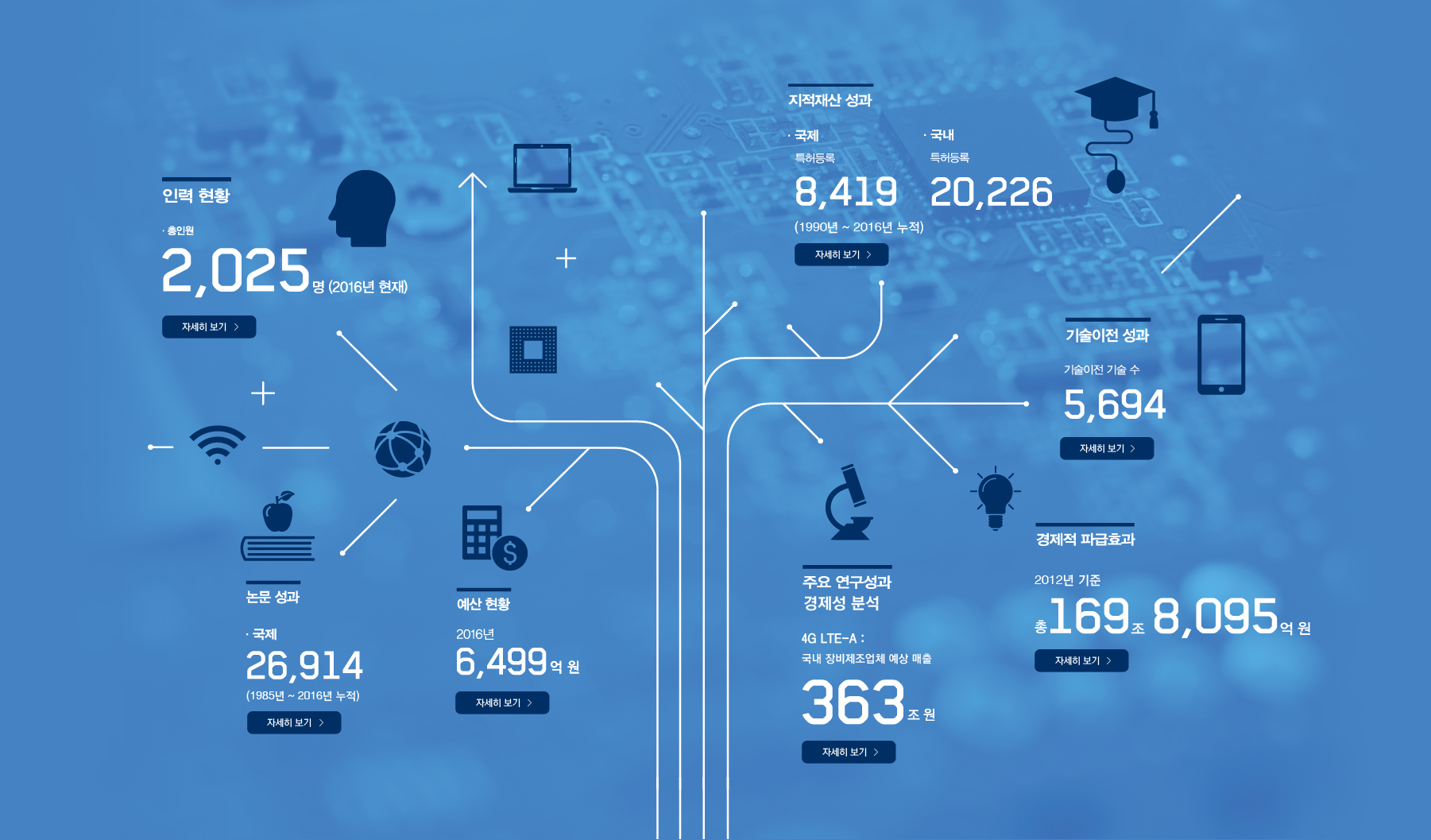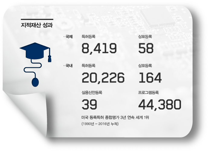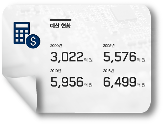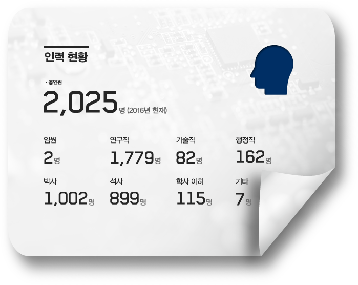 인력현황 · 총인원 2,025 명 (2016년 현재) 임원 2 명 연구직 1,779 명 기술직 82 명 행정직 162 명 박사 1,002 명 석사 899 명 학사 이하 115 명 기타 7 명 지적재산 성과 · 국제 특허등록 8,419 상표 58 · 국내 특허등록 20,226 상표등록 164 실용신안등록 39 명 프로그램등록 44,380 미국 등록특허 종합평가 3년 연속 세계 1위(1990년 ~ 2016년 누적) 기술이전 성과 기술이전 기술 수 5,694 이전 시업 수 8,041 기술료 총액 828,694백만 원 경제적 파급효과 총 169조 8,095 억 원 CDMA 54조3천923억 원 TDX 20조5천292억 원 DRAM 18조8천996억 원 LTE-Advanced 13조944억 원 ETRI 창업기업 : 354개,연구소기업 : 12개,기술지주회사 설립('10.5월),ETRI출신 IT전문인력 : 약 3,800명 배출 주요 연구성과 · 4G LTE-A : 국내 장비제조업체 예상 매출 363조 원 · CDMA : 2001년 이통산업 누적생산액 42조 원 · 휴대형 한/영 자동통역: 약 1조 원 시장 창출 예산 현황 2000년 3,022억 원 2005년 5,576억 원 2010년 5,956억 원 2016년 6,499억 원 논문 성과 · 국제 26,914 건 · 국내 35,368건 (1985년 ~ 2016년 누적)